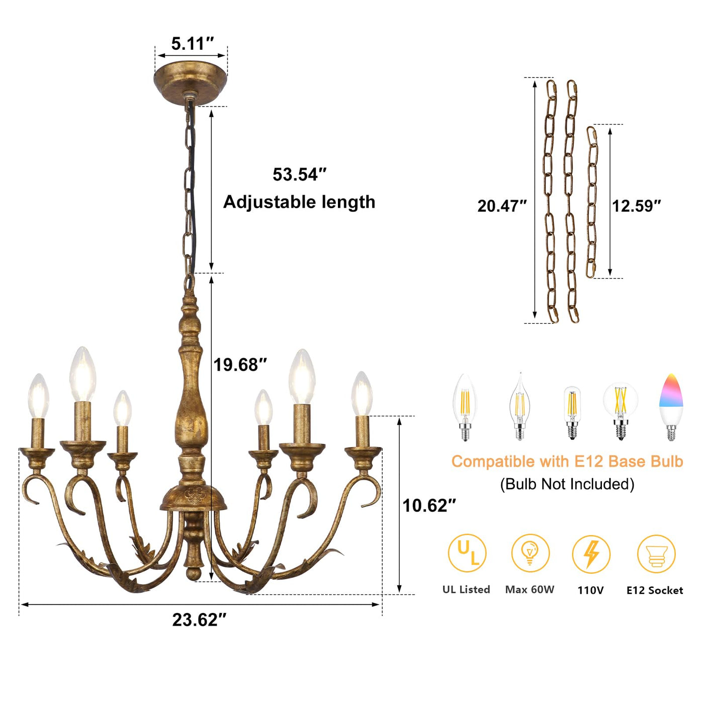 Kmaipem 6-Light Farmhouse Chandelier, 23.62'' Vintage Gold Chandeliers For Dining Room, Adjustable Rustic Metal Hanging Pendant