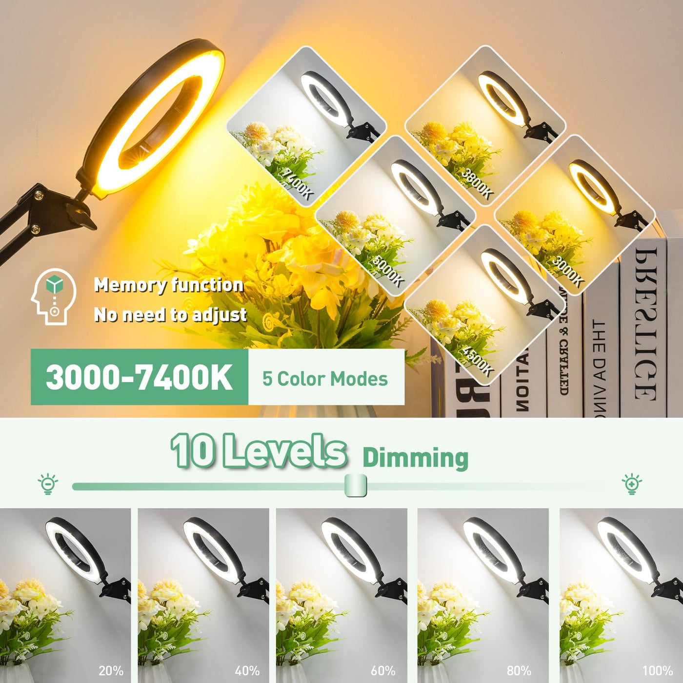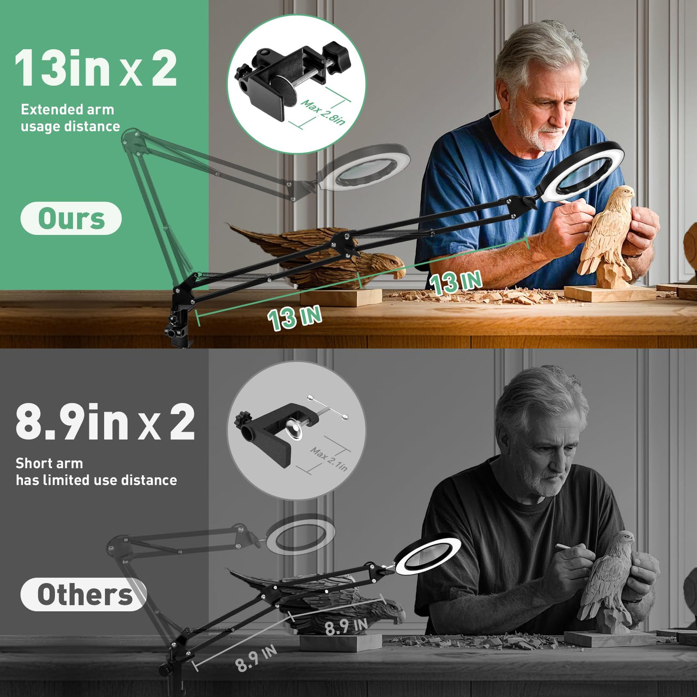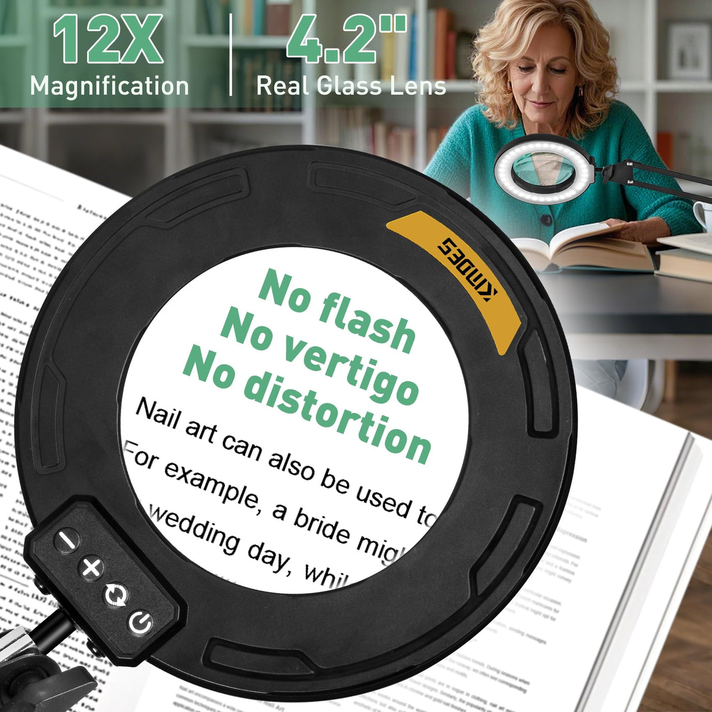 Kmdes 12X Long Arm Magnifying Glass With Light, 5 Color And Brightness Led Desk Lamp With Large Clamp, Hands Free Magnifier Light And Stand For Workbench Crafts Reading Hobby Close Work Extra-Long Swing Arm For Large Workspaces: Our 12X Magnifying Glass With Light And Stand Extends To 26 Inches From The Swing Arm To The Lamp Head, Providing Greater Flexibility Than The Standard 17.8 Inches. It Features 4 Springs And 3 Knobs For Stable Positioning At Any Angle. Upgraded Hands-Free 4-Way Metal Clamp: Made Of Durable Aluminum Alloy, This Magnifying Lamp Features A Strong Metal Clamp With Four 0.47-Inch Bracket Holes For Horizontal, Vertical, Sideways, And Inverted Mounting. It Securely Attaches To Surfaces Up To 2.8 Inches Thick, With Dual Anti-Skid Pads For Stability And Scratch Protection. Bright Dimmable Sbutton Led Lighting:This Upgraded Magnifier Lamp Features High-Brightness Leds, 50% Brighter Than Standard Desk Lamps, Delivering Even, Glare-Free Illumination. With 5 Color Modes, 10 Brightness Levels, And A Memory Function, It Offers Customizable Lighting Via A Top-Mounted 4-Button Controller. Powerful Magnification And Real Glass Lens: This Magnifying Glass With Light And Stand Comes With A 12X Real Glass Lens That Provides A Distortion-Free, High-Definition View For Intricate Work. Perfect For Crafting, Miniature Painting, And Sewing, It Increases Clarityon Every Project. Close Work & Suitable Gift: Crafted With Quality Materials And Professional Design, This Magnifier With Lightis An Ideal Gift For Family, Friends, And Professionals Like Hobby, Reading, Puzzle, Workbech, Project, Repair, Soldering, Cross Stitch,Nail, Etc And Elderly Macular Degeneration. If Dissatisfied, Please Contact Us-Customer Satisfaction Is Our Top Priority.