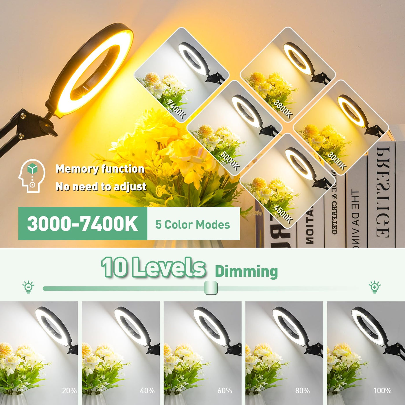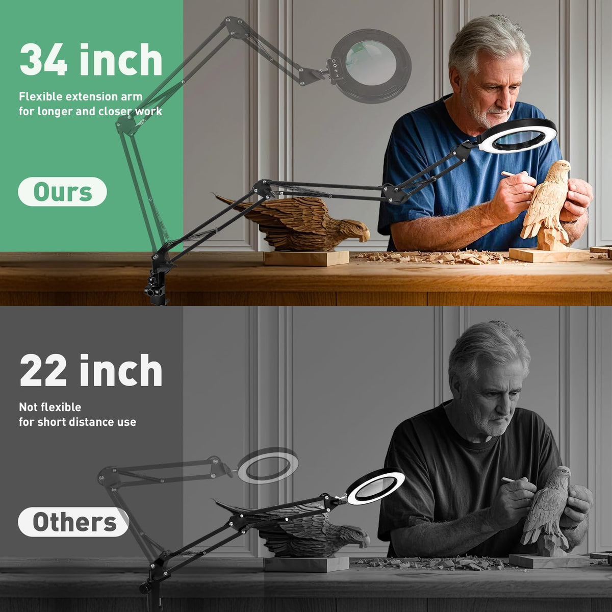 Extra-Long 3-Section Swing Arm:This 12X Lighted Magnifying Glass Features A Reinforced 3-Section Swing Arm Extending Up To 42.5 Inches, Providing Maximum Reach And Flexibility For Large Workspaces. Equipped With 3 Knobs, 6 Springs, And An Advanced Connection System, It Ensures Precise Adjustments, Stability. Bright Dimmable Sbutton Led Lighting:This Upgraded Magnifier Lamp Features 146 High-Brightness Leds, 50% Brighter Than Standard Desk Lamps, Delivering Even, Glare-Free Illumination. With 5 Color Modes, 10 Brightness Levels, And A Memory Function, It Offers Customizable Lighting Via A Top-Mounted 4-Button Controller. Upgraded Hands-Free 4-Way Metal Clamp: Made Of Durable Aluminum Alloy, This Magnifying Lamp Features A Strong Metal Clamp With Four 0.47-Inch Bracket Holes For Horizontal, Vertical, Sideways, And Inverted Mounting. It Securely Attaches To Surfaces Up To 2.8 Inches Thick, With Dual Anti-Skid Pads For Stability And Scratch Protection. Powerful Magnification And Real Glass Lens: This Magnifying Glass With Light And Stand Comes With A 12X Real Glass Lens That Provides A Distortion-Free, High-Definition View For Intricate Work. Perfect For Crafting, Miniature Painting, And Sewing, It Increases Clarityon Every Project. Close Work & Suitable Gift: Crafted With Quality Materials And Professional Design, This Magnifier With Light Is An Ideal Gift For Family, Friends, And Professionals Like Hobby, Reading, Puzzle, Workbech, Project, Repair, Soldering, Cross Stitch,Nail, Etc And Elderly Macular Degeneration. If Dissatisfied, Please Contact Us-Customer Satisfaction Is Our Top Priority.