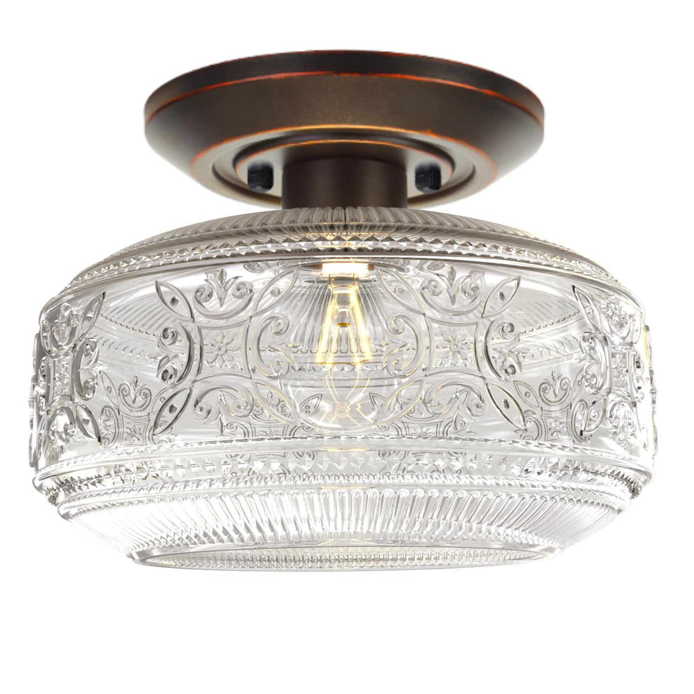 The fixture features a classic design with a durable oil-rubbed bronze finish and a stylish glass shade that diffuses light beautifully. Constructed from well-made materials, this ceiling light ensures long-lasting performance. With its straightforward installation process, it can be easily mounted on any flat ceiling surface, making it a practical addition to your home.