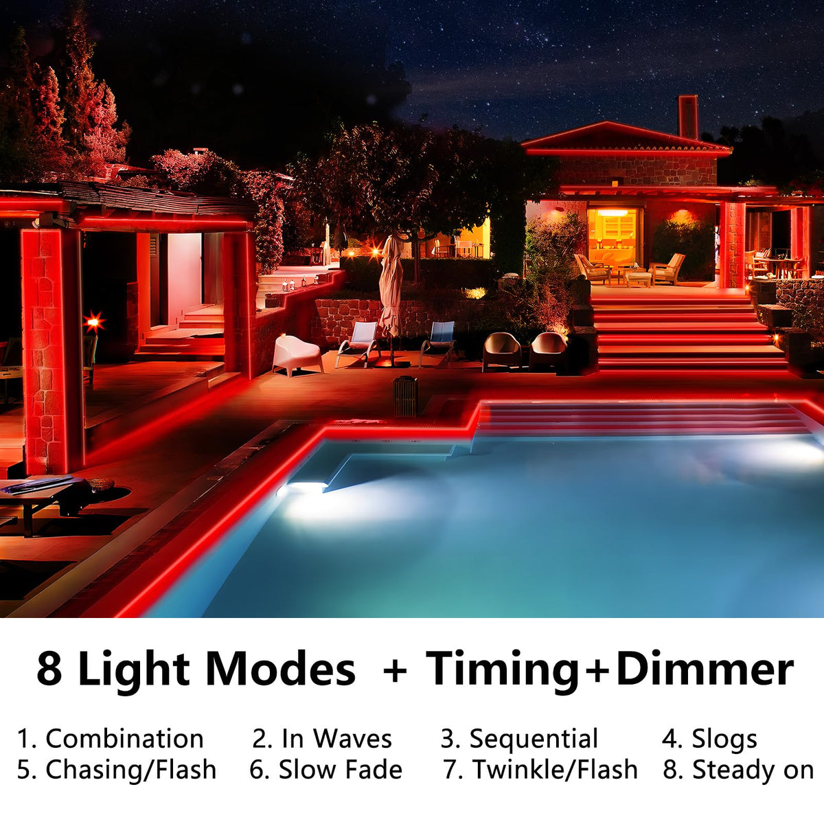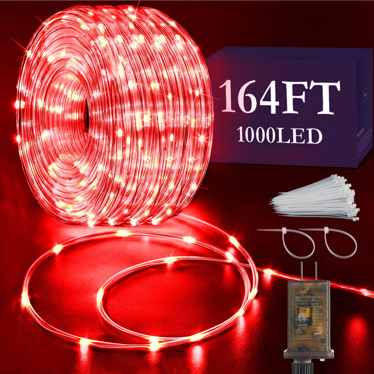 Q: What are the main features of the KNONEW 164FT 1000LED Rope Lights?A: The KNONEW 164FT 1000LED Rope Lights feature a total length of 164 feet with 1000 LED bulbs, IP65 waterproof rating, 8 different lighting modes, a built-in timer with memory function, and flexible installation for various decorative shapes.