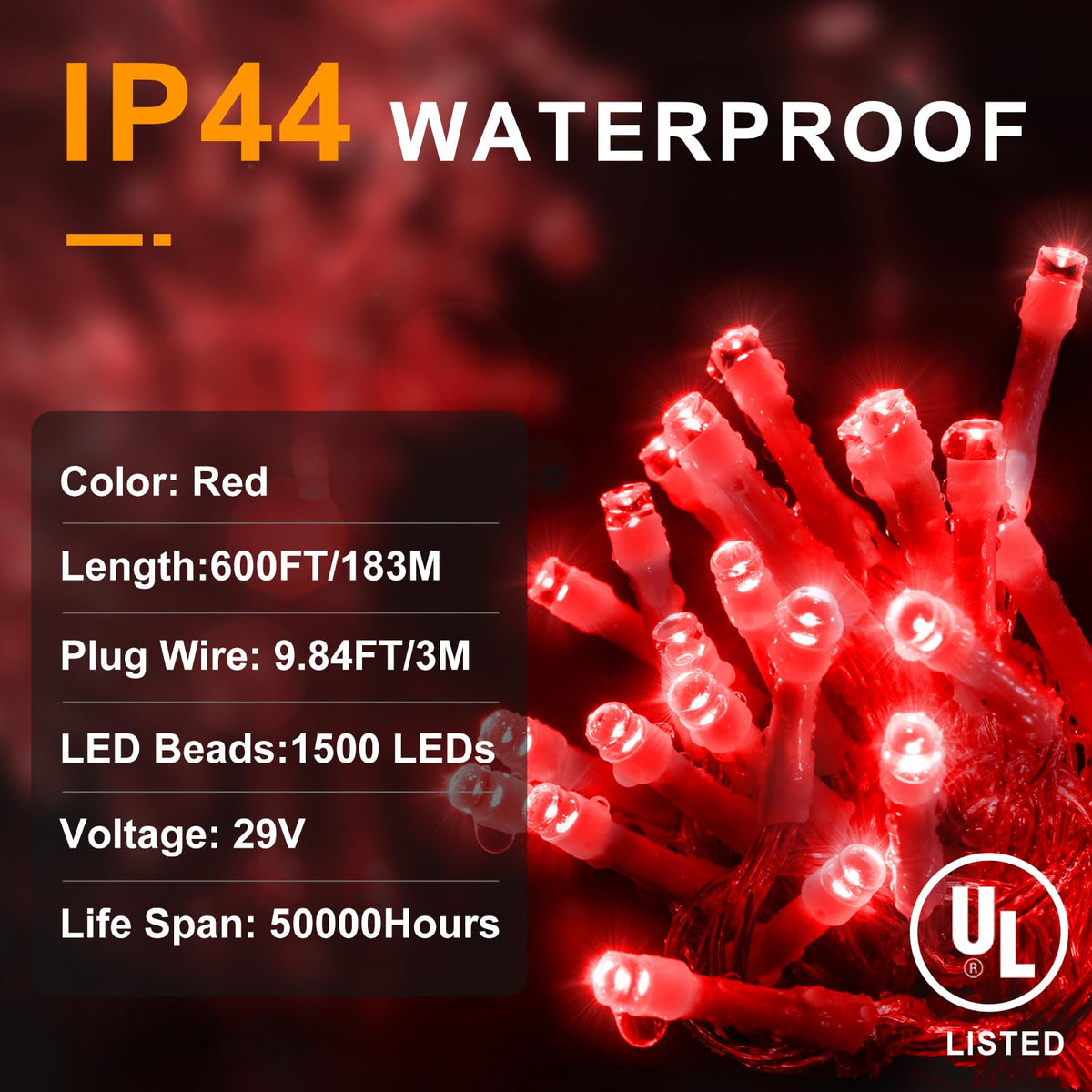 Q: Are these Christmas lights safe for indoor and outdoor use?A: Yes, these Christmas lights are designed for both indoor and outdoor use. They have an IP44 waterproof rating, ensuring they can withstand various weather conditions. However, it is important to keep the plug protected from water to maintain safety.