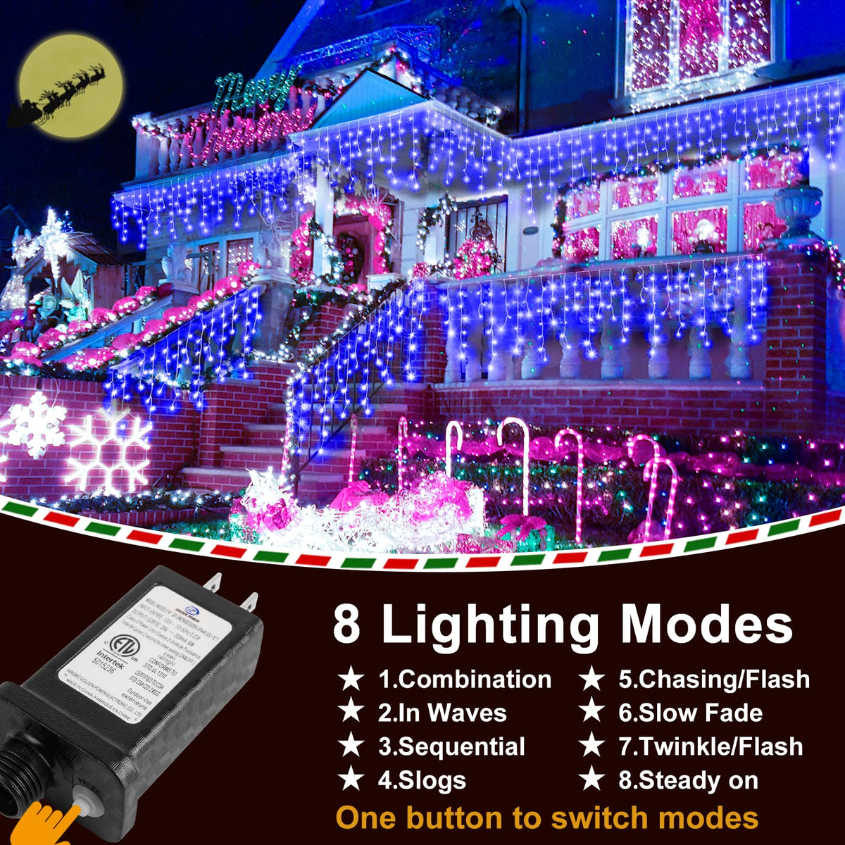 These Christmas lights feature a super long length of 164 feet, equipped with 320 drops and a total of 1600 LED beads. The lead cable measures approximately 10 feet, making it effortless to wrap around eaves, fences, or trees without the need for extensions. With 1 steady-on setting plus 7 variable lighting modes, including Combination, In Waves, Sequential, Slo-Glo, Chasing, Slow Fade, Flash, and Steady On, you can easily switch modes to suit the mood of any occasion. The timer and memory function allows you to set the lights to operate for 6 hours on and 18 hours off daily, ensuring convenience and energy savings.