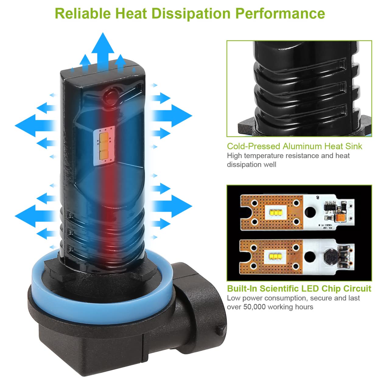 Q: What is the color temperature of the 2PCS LED Fog Light Bulb, and how does it affect visibility?A: The 2PCS LED Fog Light Bulb emits a 6000K white light, which is ideal for fog and low visibility conditions. This color temperature closely resembles daylight, enhancing visibility and reducing eye strain compared to warmer yellow lights.