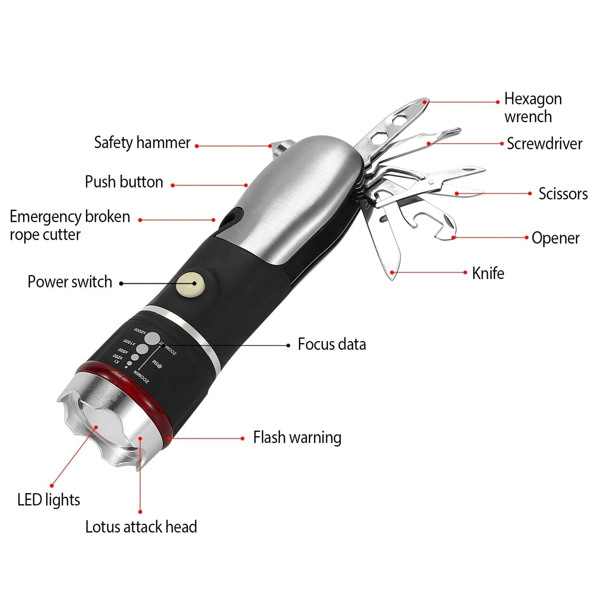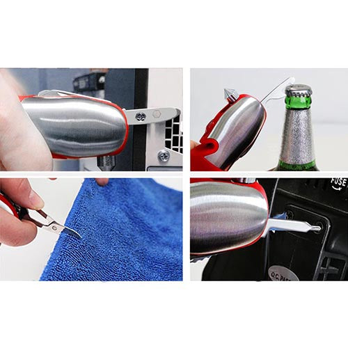 - **Multi-Functional Toolset**: Equipped with 13 essential tools, including a powerful flashlight, a safety hammer for breaking glass, a safety cutter for swift seatbelt release, scissors, and a bottle cap opener. This kit is designed to address various emergency needs, providing peace of mind whether you're on the road or at home.