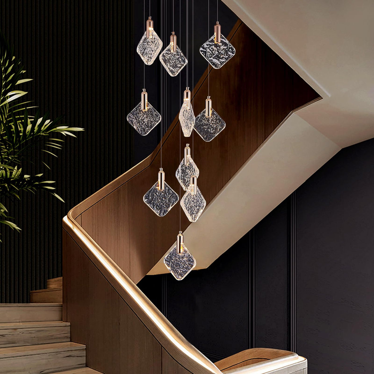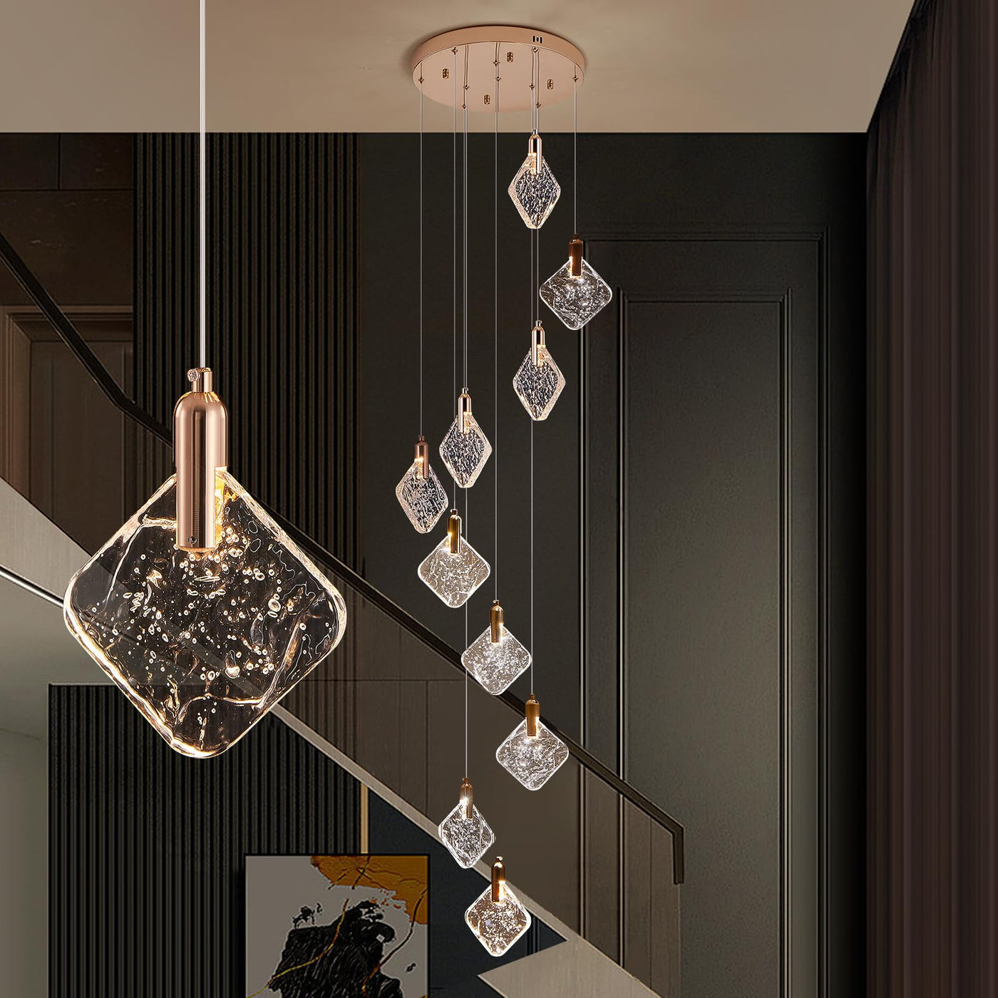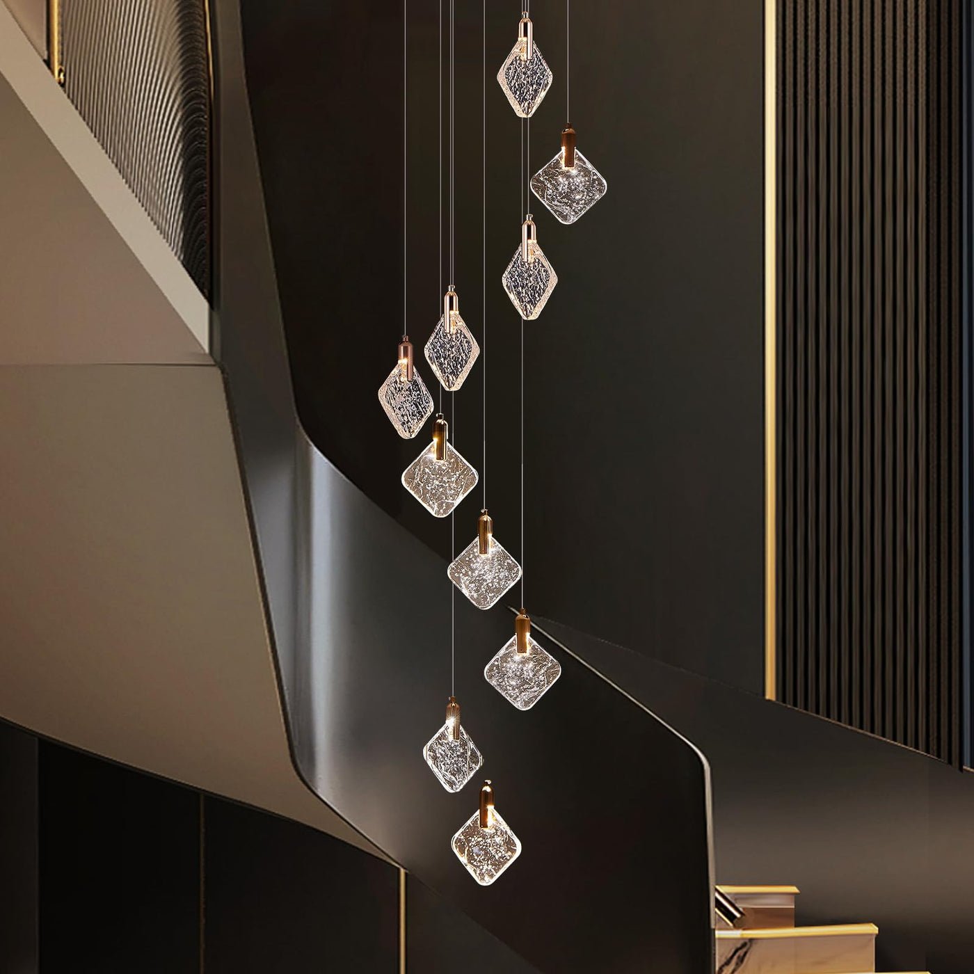 Kokaizeeki Staircase Crystal Chandelier 10-Light Pendant Light, Modern Square Led H118 High Hanging Ceiling Fixture With Gold Ba