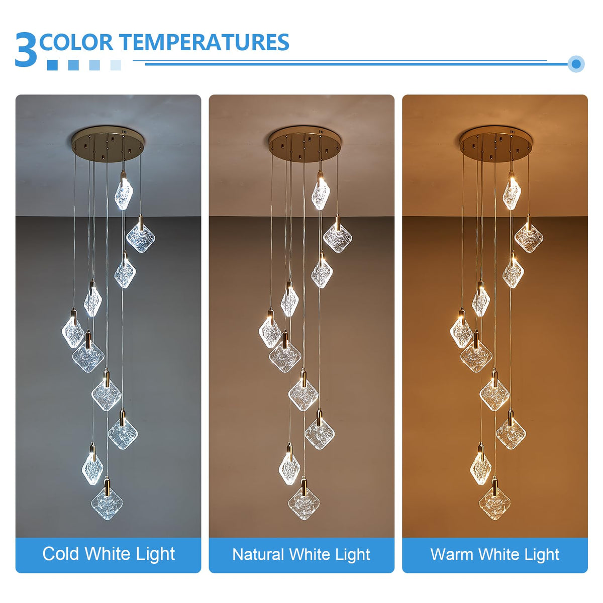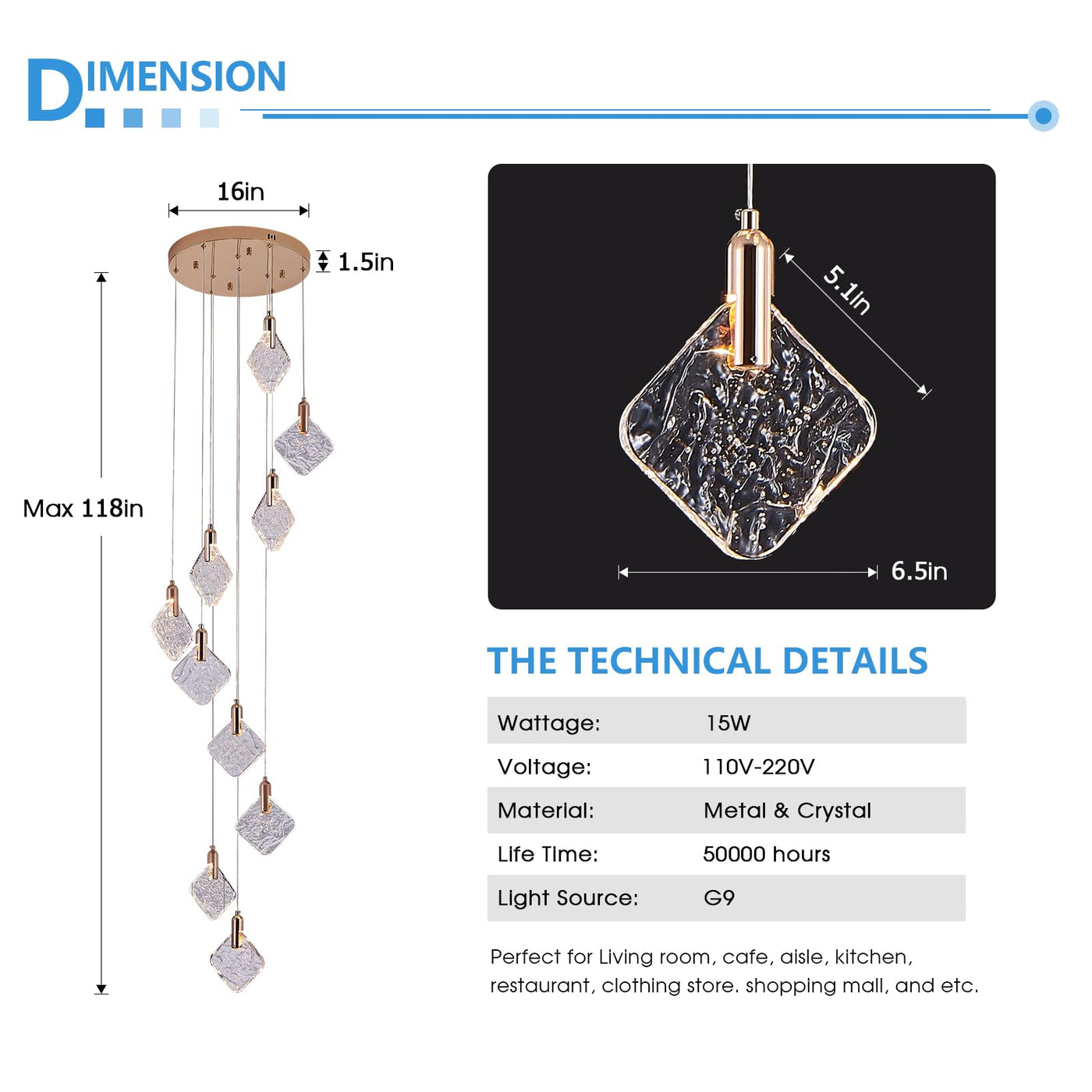 Illuminate Your Home with Elegance - Modern Crystal Chandelier Elevate your living space with this stunning Modern Crystal Chandelier, a perfect blend of sophistication and functionality. Featuring a sleek polished gold metal canopy and 10 sparkling square crystal pendants, this chandelier creates a captivating visual effect. As light reflects off the crystals delicate bubbles, it casts a beautiful, ambient glow that transforms your home into a cozy haven. Designed for high-ceiling spaces, this chandelier boasts an adjustable height of up to 118 inches, making it an ideal addition to foyers, staircases, living rooms, dining areas, and entryways. Its modern spiral design adds a touch of luxury to any room, while its versatility allows it to complement both traditional and contemporary decor. Equipped with a 50W integrated LED, this chandelier offers energy-efficient illumination with 4000 lumens of brightness. The color temperature is adjustable from a warm 2700K to a cool 6000K, and the dimming function allows you to fine-tune the brightness from 5% to 100%, ensuring the perfect lighting for every occasion. The long-lasting LED has an impressive 50,000-hour lifespan, offering you years of reliable use without the hassle of frequent bulb replacements. Installation is quick and easy, with all the necessary hardware and clear instructions included. This chandelier is compatible with both flat and sloped ceilings, making it suitable for a wide range of settings. Whether you're updating your living room, designing your dining space, or enhancing your entryway, this chandelier offers effortless elegance and practical functionality.