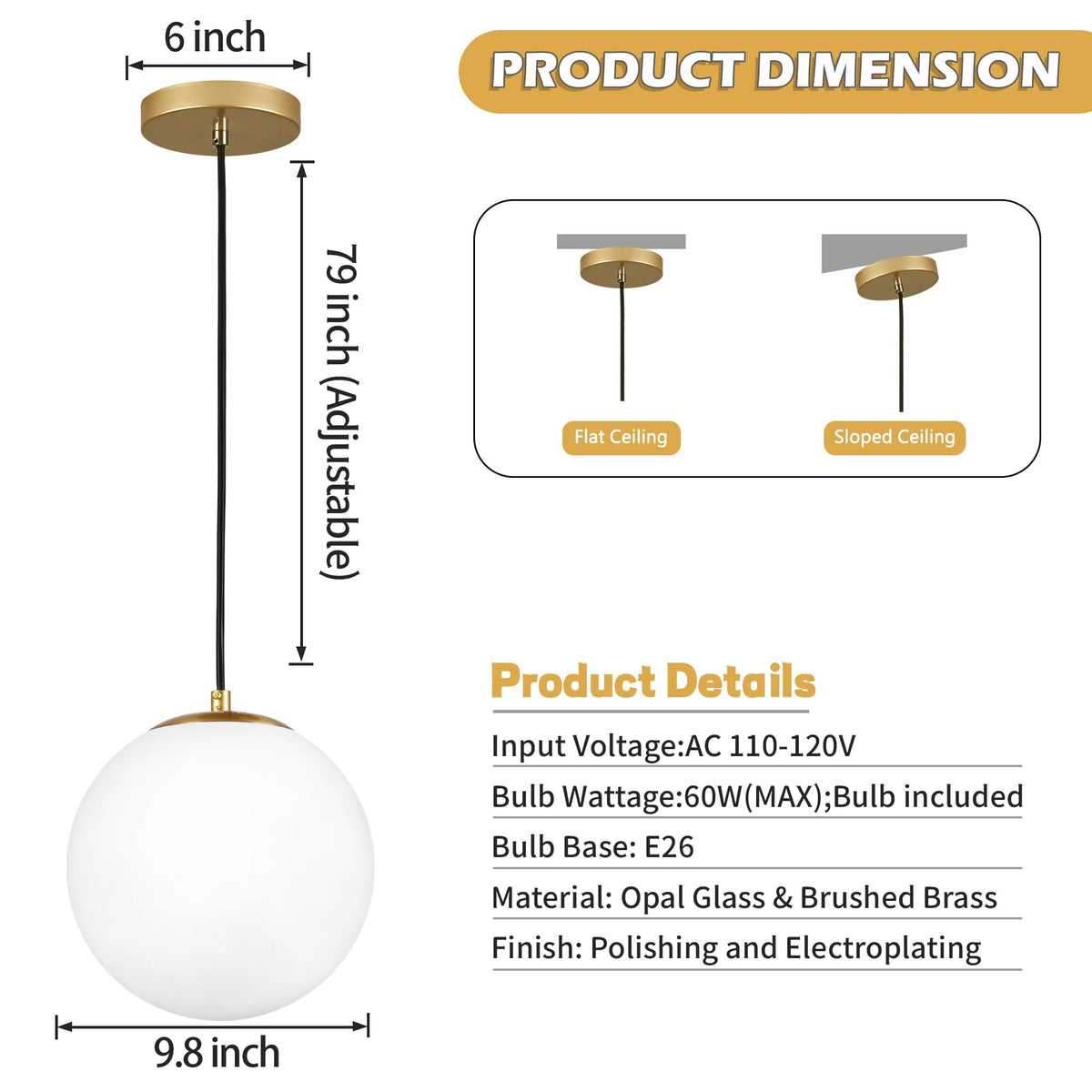 - **Sleek Design**: The pendant light boasts a 9.8-inch diameter white glass globe that provides a soft, diffused light, creating a warm and inviting atmosphere. Its minimalist design fits effortlessly into various decor styles, from mid-century modern to contemporary.