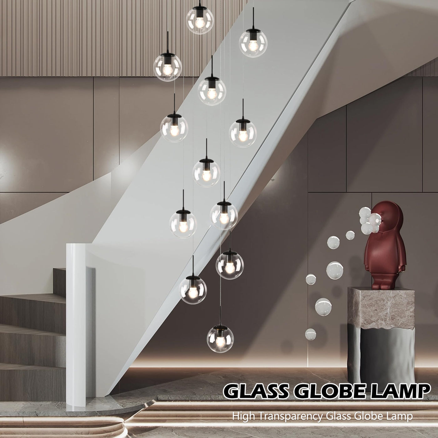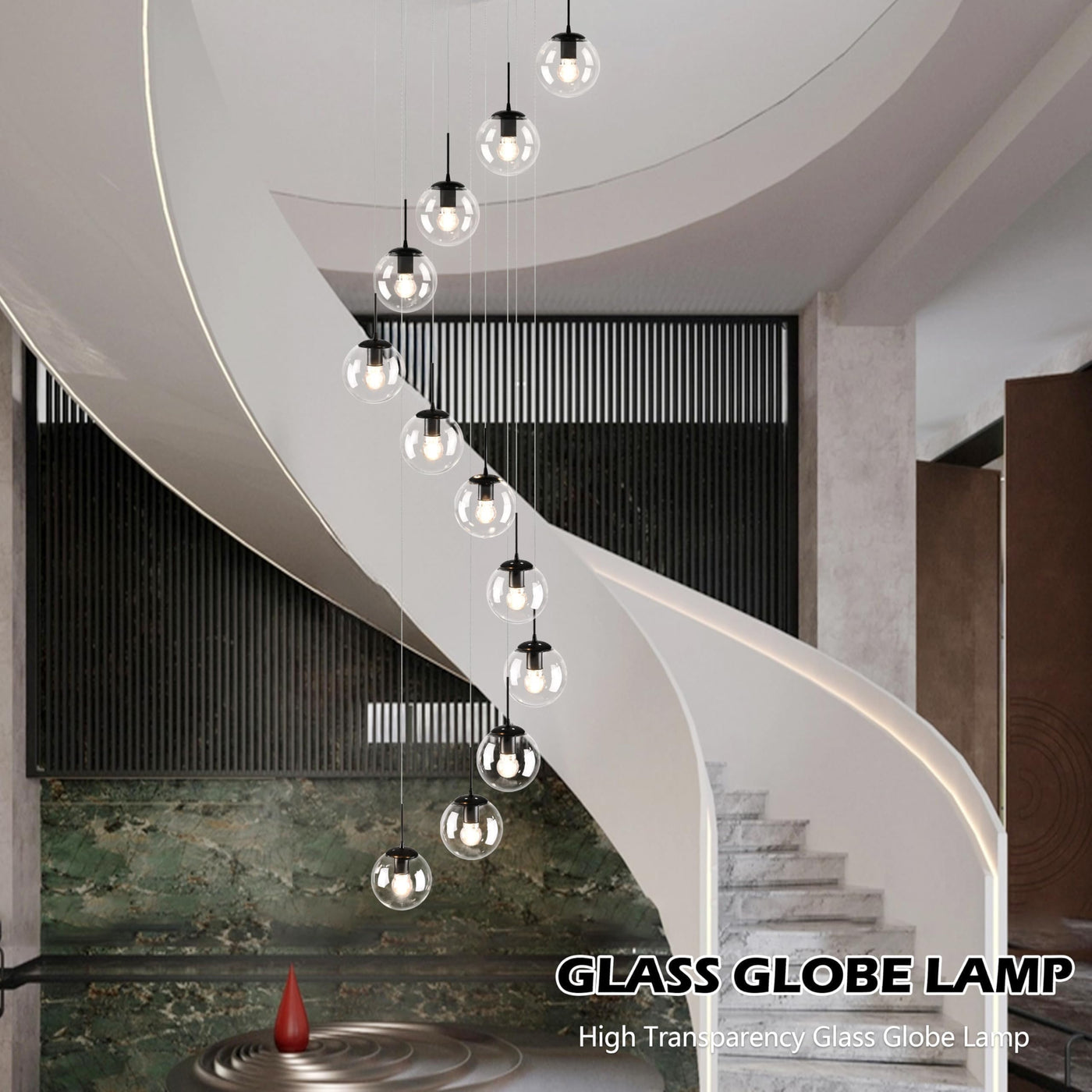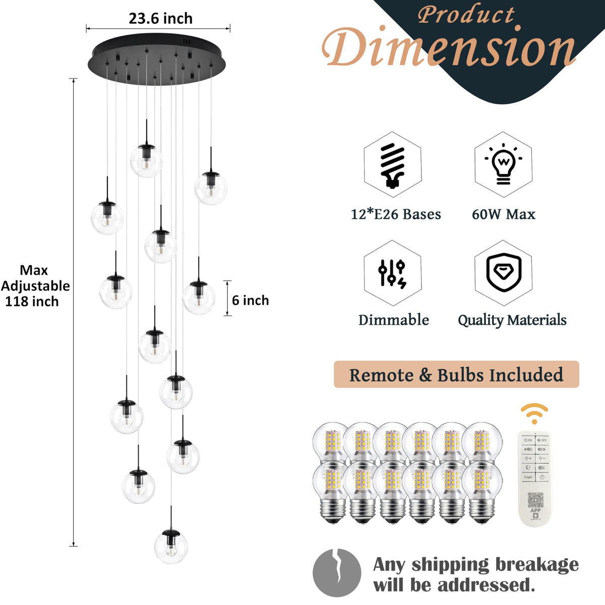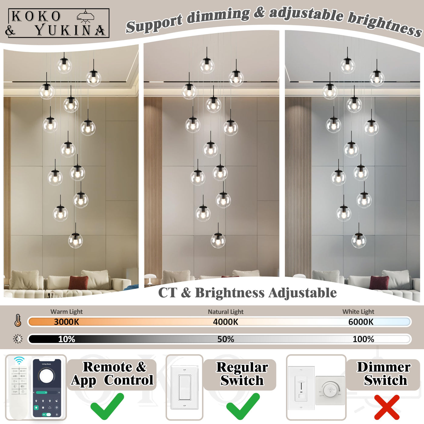 Koko&Yukina 12-Light Black Mid Century Modern Chandelier For Living Room Staircase Chandelier For Entryway Clear Globe Glass Chandelier High Ceiling Chandeliers Foyer Entryway (Bulb & Remote Incl.)