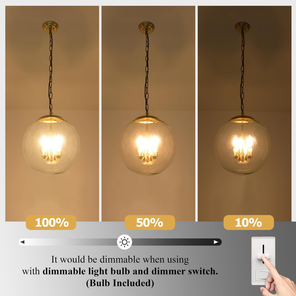 Q: Is the bulb included with the pendant light, and is it dimmable?A: Yes, the pendant light comes with three E12 bulbs, each with a maximum wattage of 60W. Additionally, the brightness can be adjusted from 10% to 100%, allowing you to create the perfect ambiance in your space.