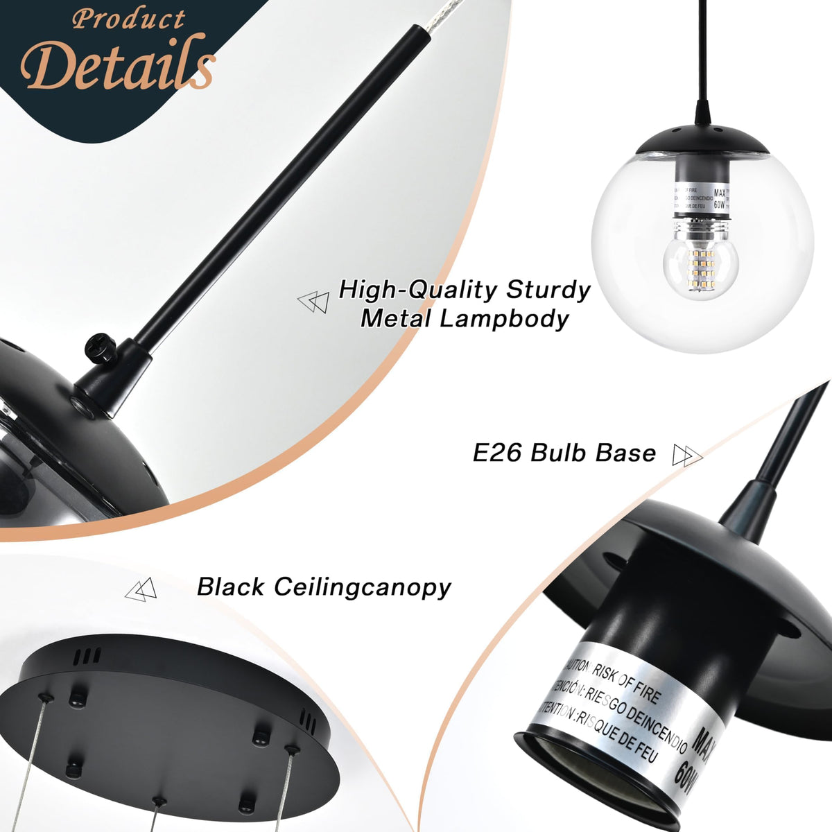 Koko&Yukina 3-Light Globe Glass Pendant Light Modern Black Clear Globe Glass Chandelier Adjustable Length Pendant Lights Fixture