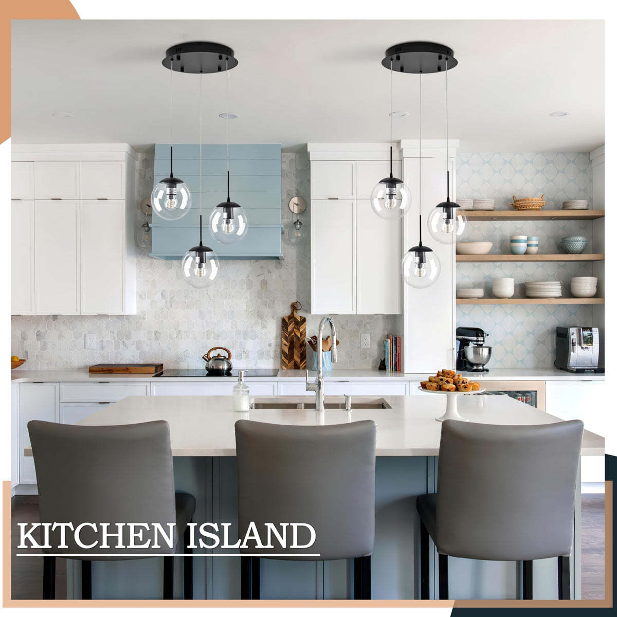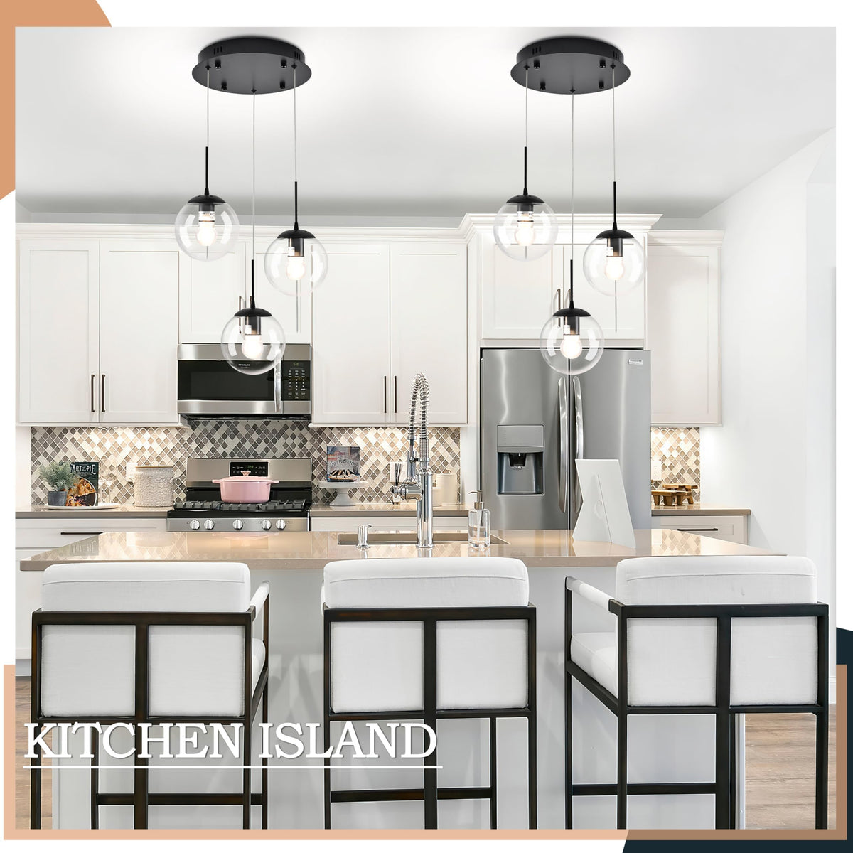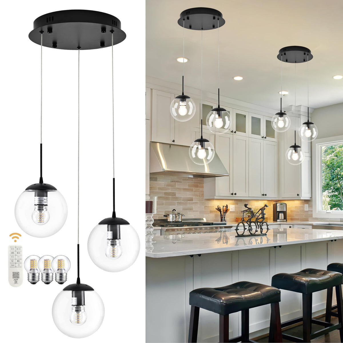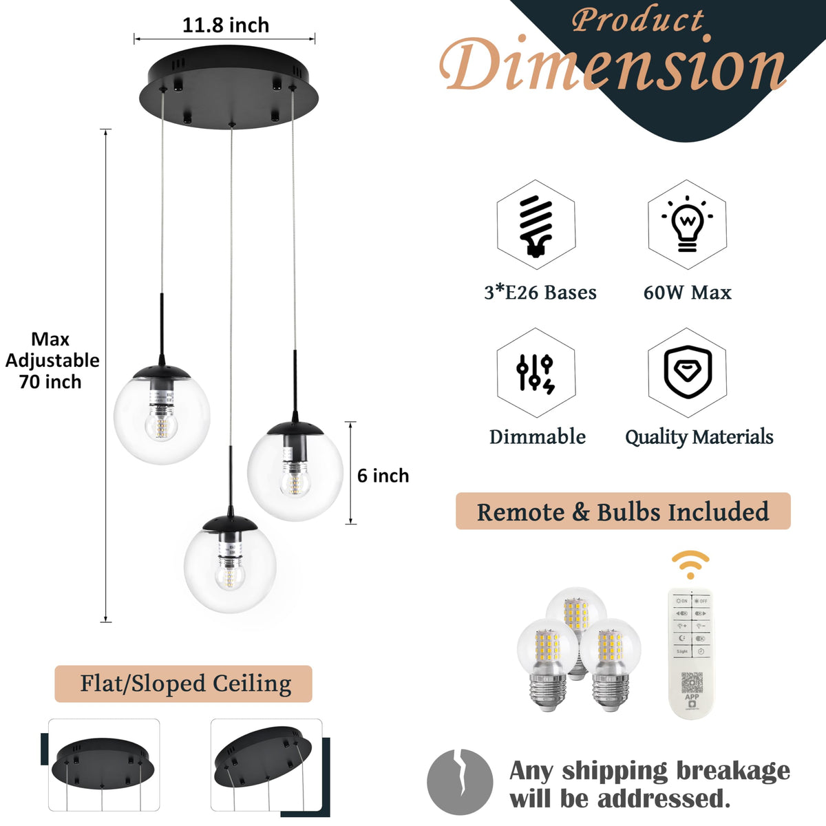 KoKo&Yukina 3-Light Globe Glass Pendant Light Modern Black Clear Globe Glass Chandelier Adjustable Length Pendant Lights Fixtures High Ceiling Light for Kitchen Island Foyer (Bulb & Remote Incl.)