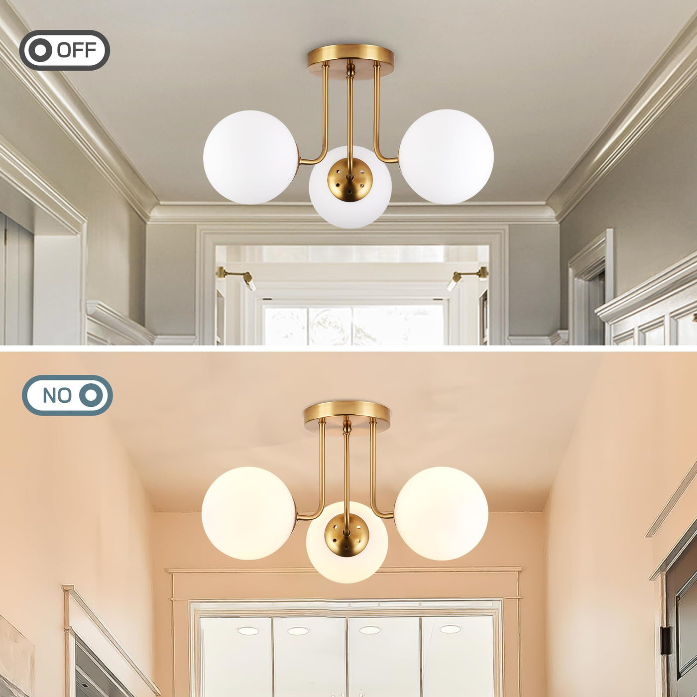 Koko&Yukina 3-Light Semi Flush Mount Ceiling Light Globe Ceiling Light Mid Century Ceiling Light With Opal Milk Glass Globe & Br