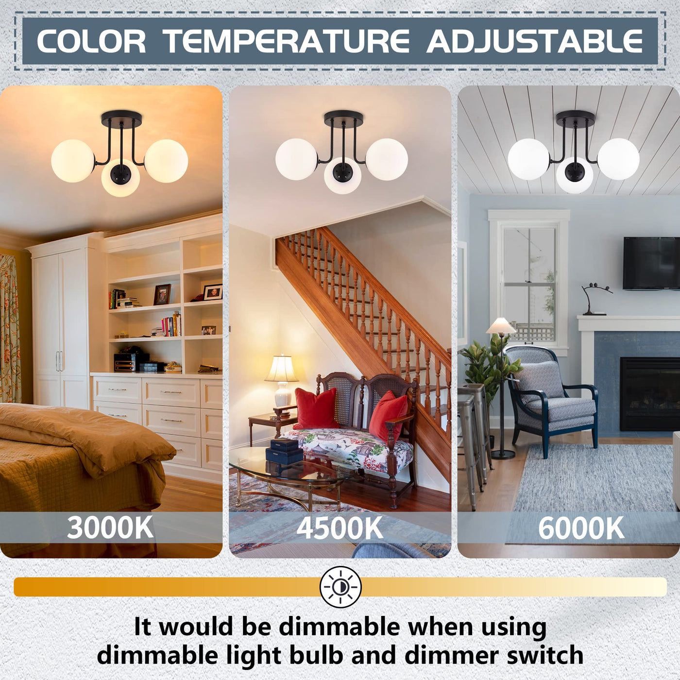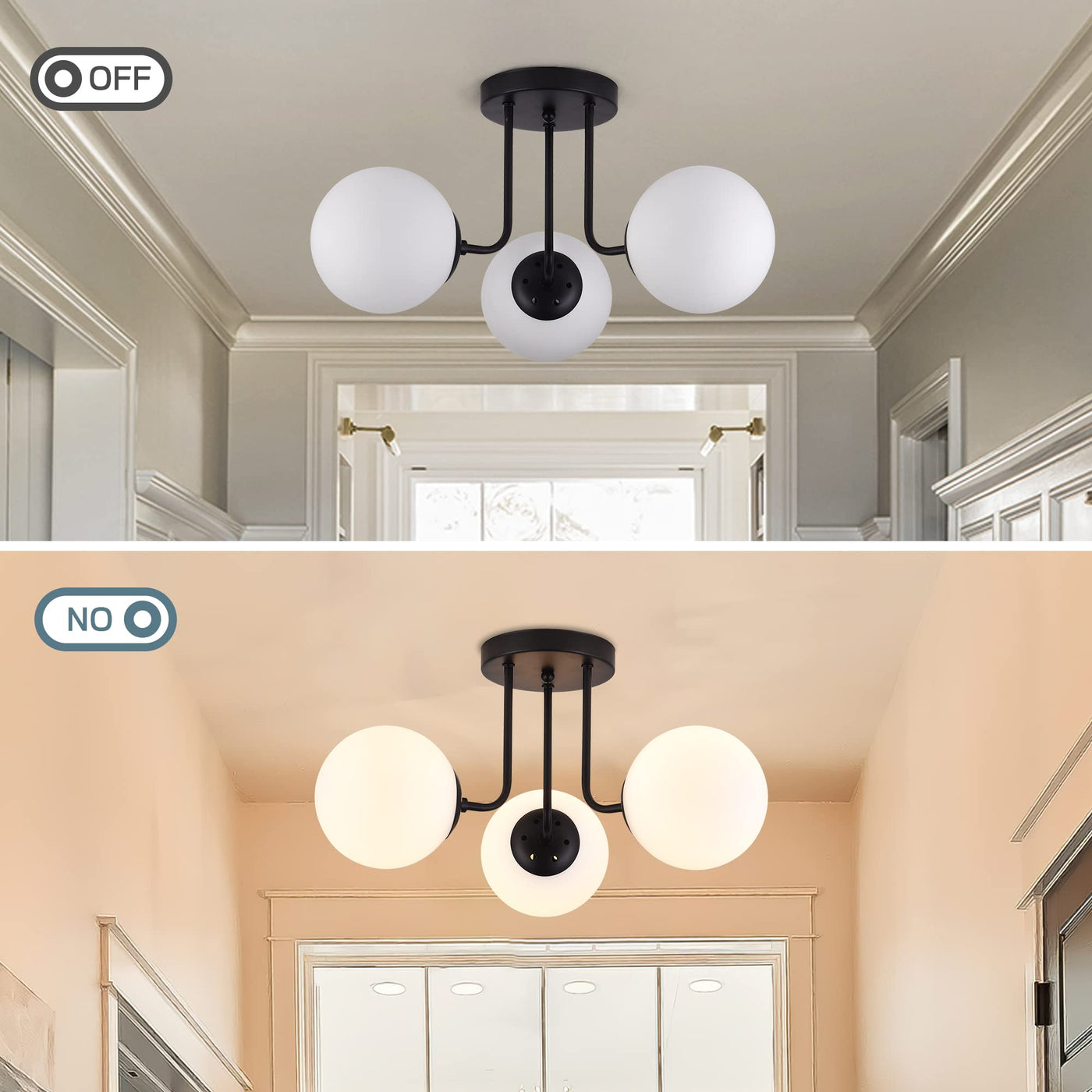 Koko&Yukina 3-Light Semi Flush Mount Ceiling Light With Opal Milk Glass Globe & Matte Black For Bedroom, Hallway, Entryway, Kitc