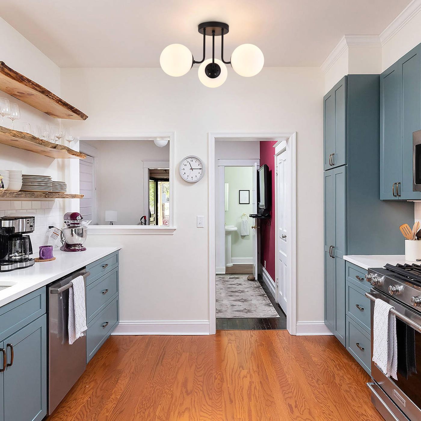 Q: Can this ceiling light be used in different rooms?A: Yes, the KoKo&Yukina 3-Light Semi Flush Mount Ceiling Light is versatile and suitable for various spaces such as bedrooms, hallways, kitchens, and living rooms. Its classic design complements a range of home styles, including mid-century, modern, contemporary, and farmhouse.