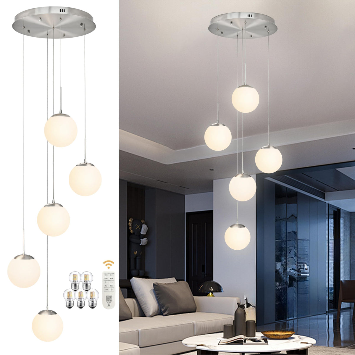 KoKo&Yukina 5-Light Globe Glass Pendant Light Adjustable Length Pendant Lights Fixtures Modern Nickel Chandelier with Milky White Glass Ceiling Lights for Foyer Hallway Bedroom (Bulb & Remote Incl.)