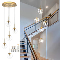 Koko&Yukina 5-Light Globe Glass Pendant Light Adjustable Length Pendant Lights Modern Gold Clear Globe Glass Chandelier High Ceiling Lights Fixtures For Foyer Staircase Entryway (Bulb & Remote Incl.)