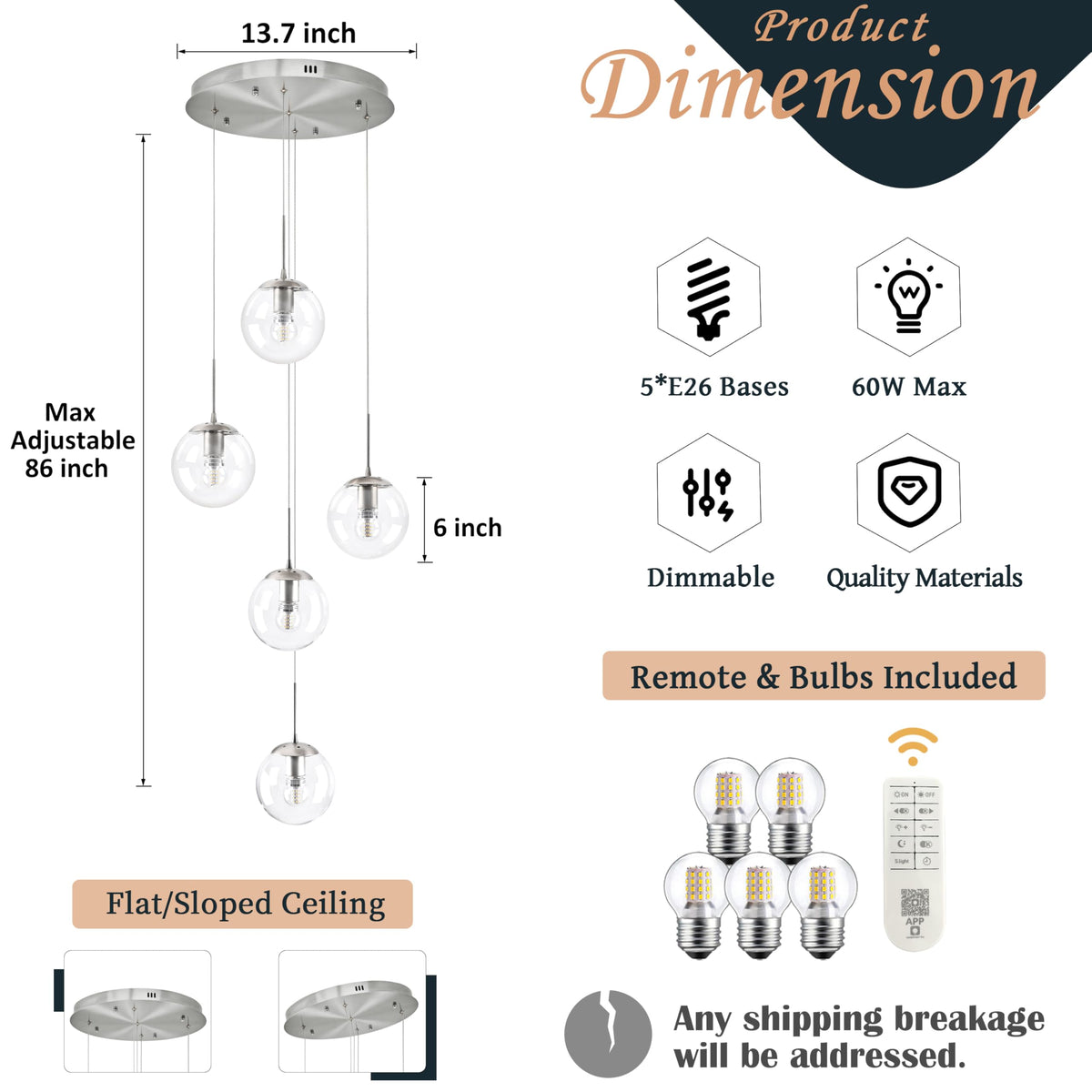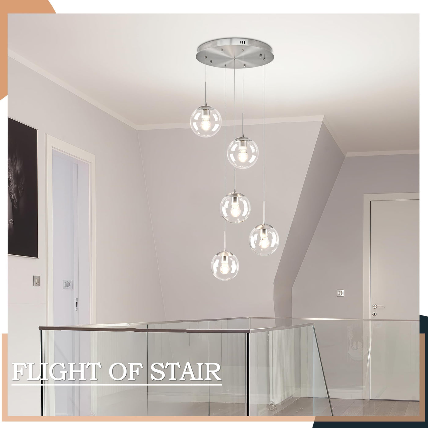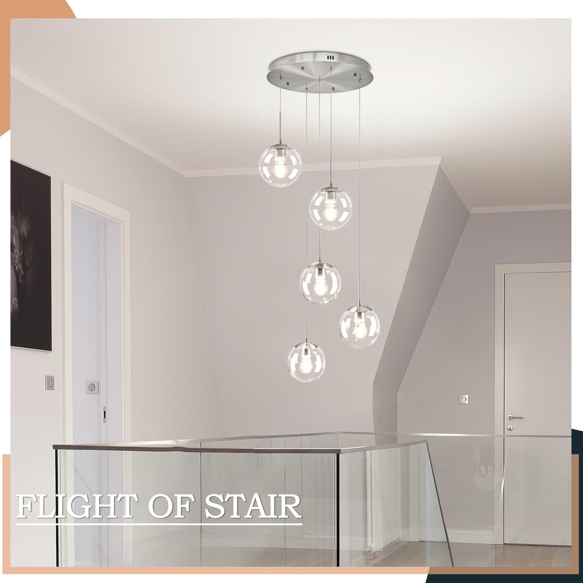 Koko&Yukina 5-Light Globe Glass Pendant Light Adjustable Length Pendant Lights Modern Nickel Clear Globe Glass Chandelier High Ceiling Lights Fixtures For Foyer Hallway Staircase (Bulb & Remote Incl)