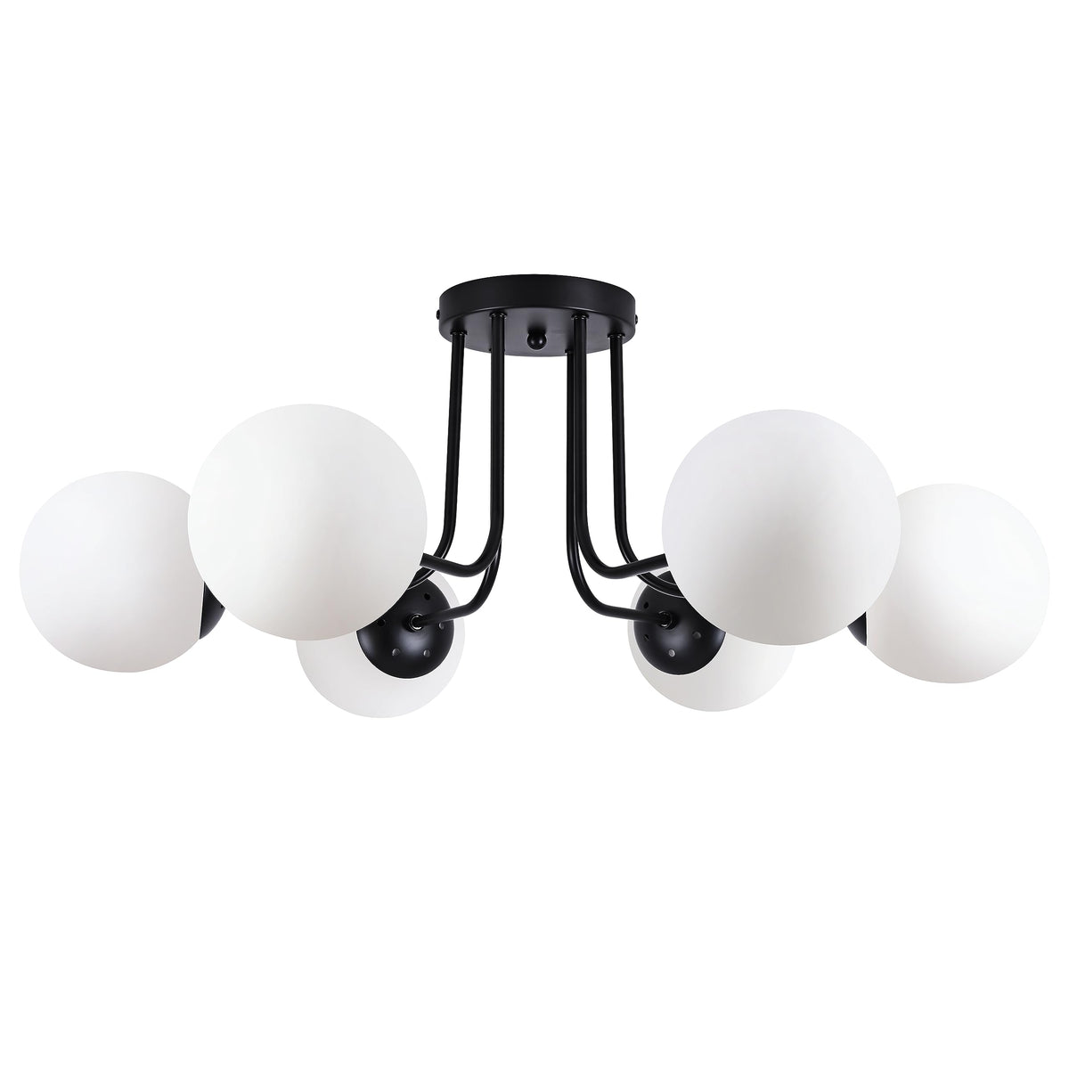 Q: What is the design style of the KoKo&Yukina 6-Light Semi Flush Mount Ceiling Light?A: The KoKo&Yukina 6-Light Semi Flush Mount Ceiling Light features a modern design with a matte black metal finish and white opalescent glass globes, making it a perfect fit for mid-century, vintage, industrial, or farmhouse decor.