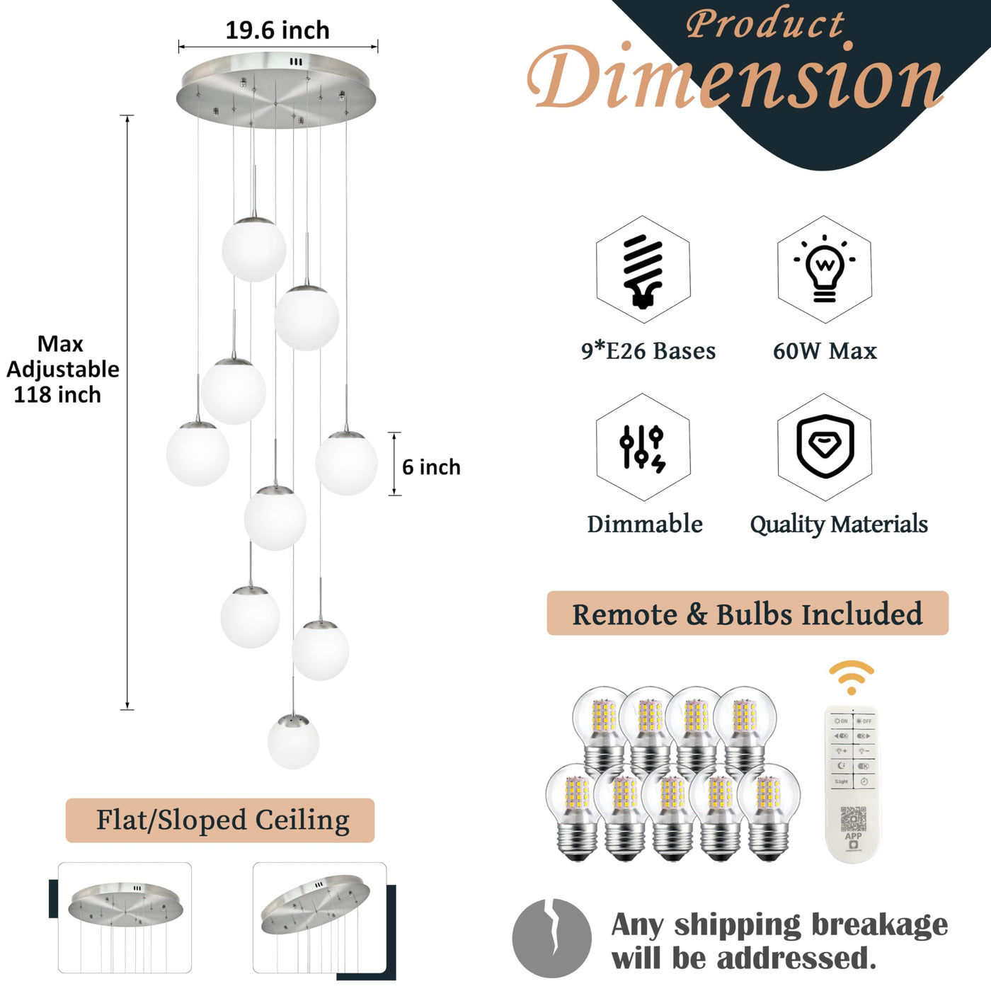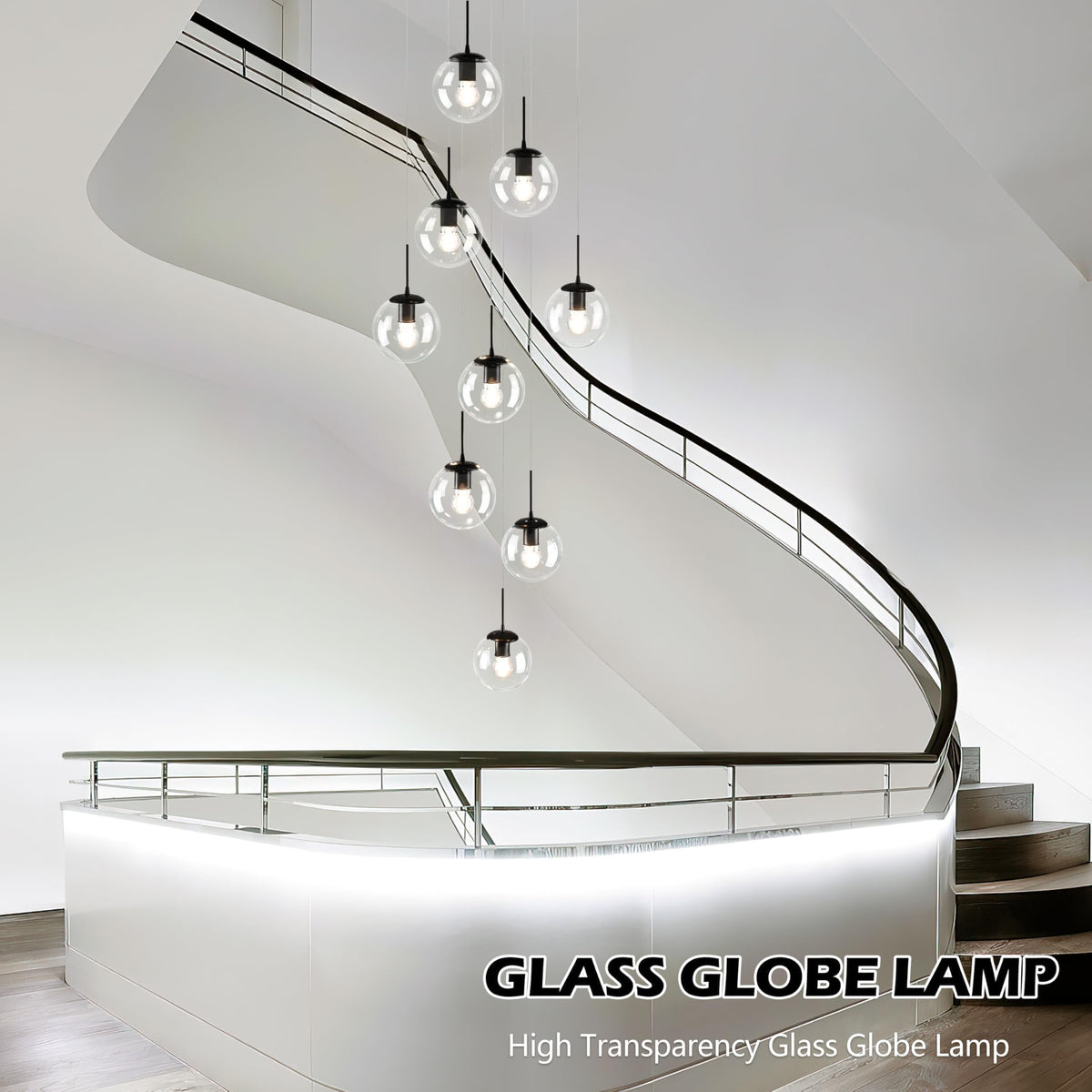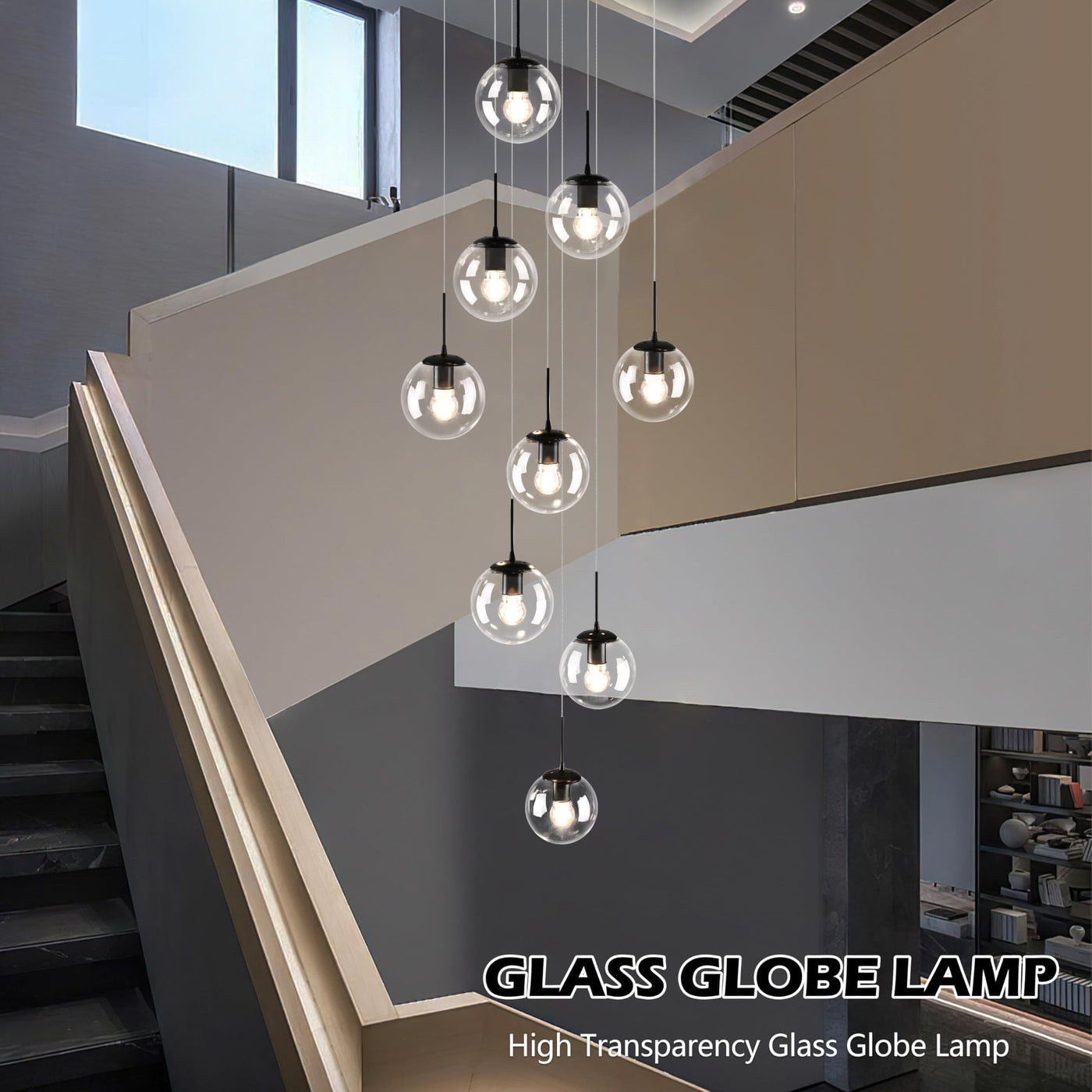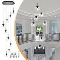 Koko&Yukina 9-Light Globe Glass Pendant Light Adjustable Length Pendant Lights Fixtures Modern Black Clear Globe Glass Chandelier High Ceiling Lights Fixtures For Foyer Staircase (Bulb & Remote Incl)
