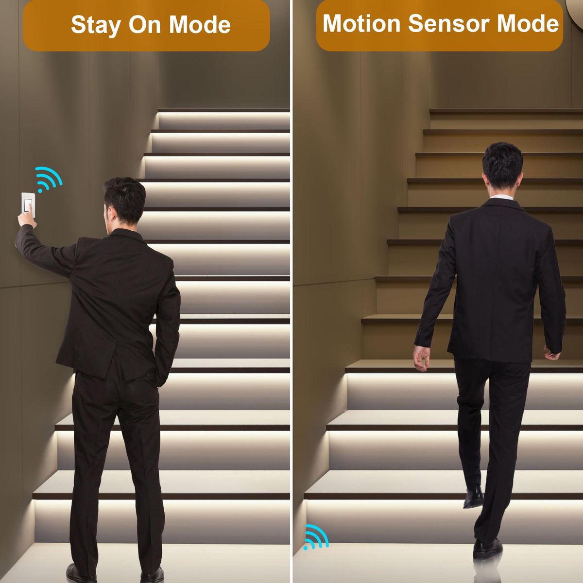Q: Can I adjust the brightness and delay times of the stair lights?A: Yes, the KOMIGAN LED Stair Lighting Kit allows you to easily adjust the brightness, speed, and delay times according to your preferences. Additionally, you can switch between 'Motion Trigger Mode' and 'Stay On Mode' to suit different lighting needs.