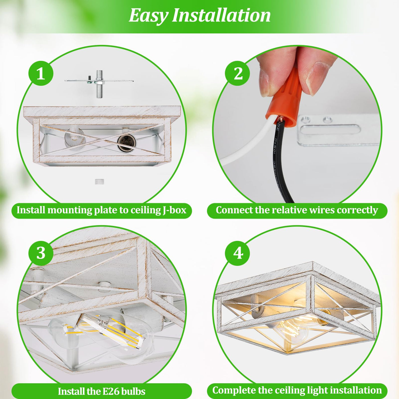 Q: What style of decor does this light fixture complement?A: The Kondras Antique White Hallway Light Fixture features a modern industrial design with a stylish square frame, making it suitable for various decor styles, including farmhouse, contemporary, and vintage themes.