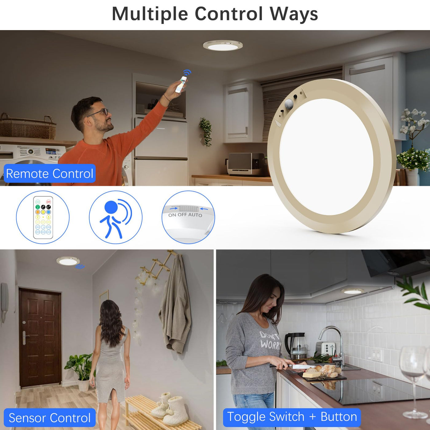 Koopala Battery Operated LED Ceiling Light Fixture with Motion Sensor, 3 Colors/Brightness, Gold, Model KP-DY102-G-US