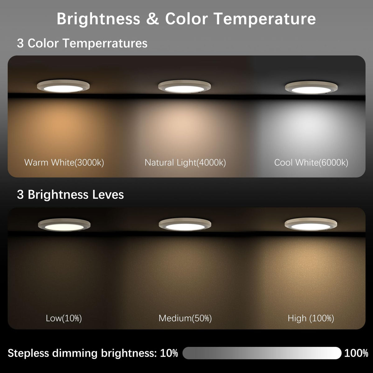 Adjustable Brightness & Color Temperature: Offers three color temperatures (3000K/4000K/6000K) and three brightness levels (10%, 50%, 100%), with stepless dimming options.