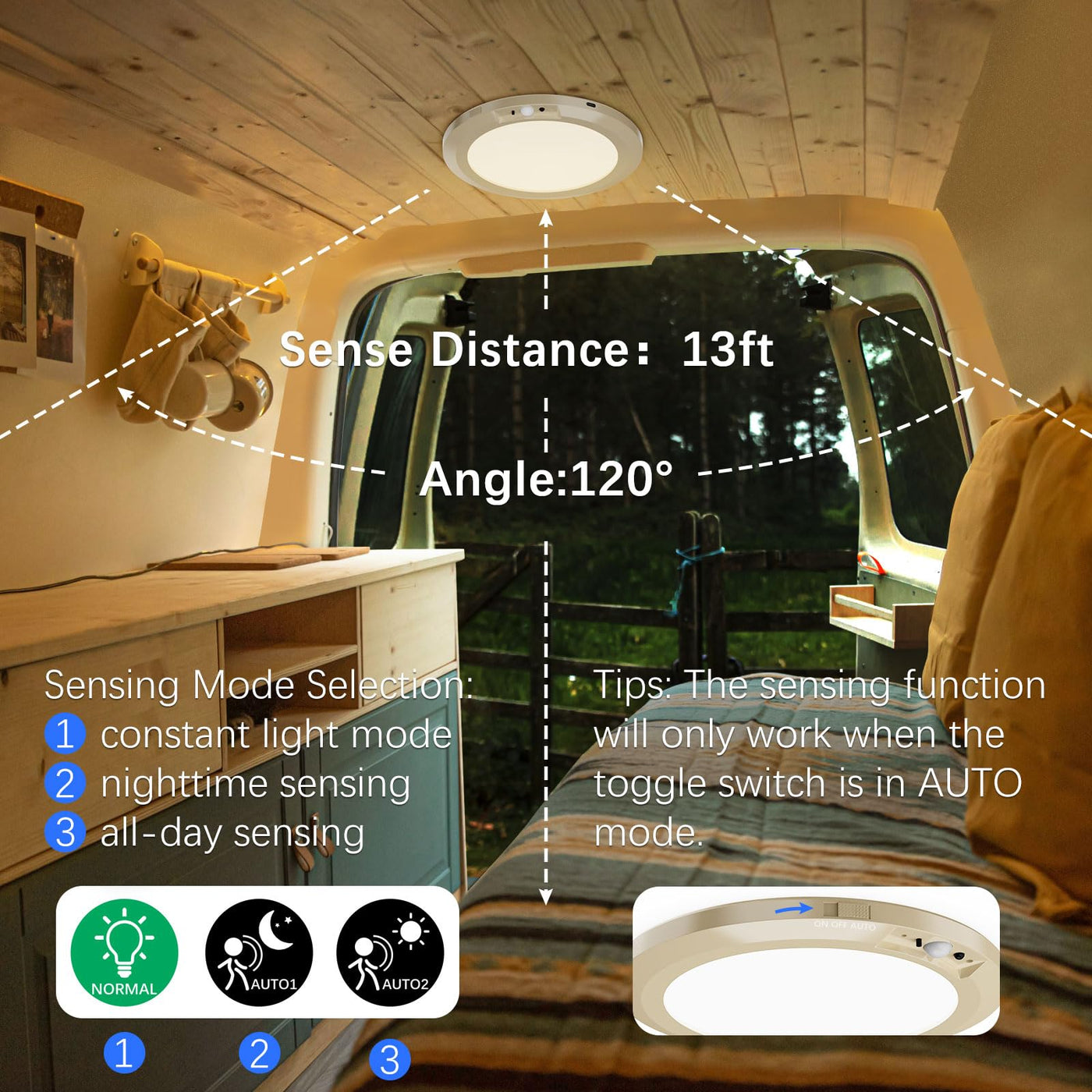 3 Sensing Modes: Includes constant light mode, nighttime sensing mode, and all-day sensing mode, easily controlled via remote.