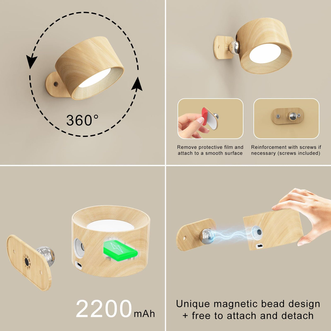 ?Wall Lights Built-in Rechargeable Battery Operated?Koopala modern cordless wall lamps built-in rechargeable battery powered inside. Fully charged less than 4hrs can work for up to 20hrs in lowest mode,max brightness is up to 6hrs. and portable cordless wall sconces fully will automatically cut off the electricity to protect the battery, so that it's life is longer than other. | ?Widely Application & Multifunction Wall Sconces?The Lamps can be used as wall sconces/flashlight. As wall lights installation doesn't require any tools, it's with sticky adhesive stick and the installation is completed in 1s. wall lamp can also be fixed with screws. Indoor wall sconces perfect for reading working study bedside bath living room hallway cabinet stairway toile makeup. As flashlight, this light use magnetic technology, you can take it off the wall in 1s and use it as removable light, emergency light etc. | ?360?Free Rotations Magnetic Ball ?The wall mount LED lamps with 360? rotation magnetic ball, so you can diy the light source direction. Own this small wall sconces, you can experience removing the lamp head in 1s or installing it in 1s. Don't need tools, the most important won't damage your wall. | ?Touch Control 3 Brightness Levels & 3 Color Temp & ON/OFF?Dimmable wall lights Lightly touch button to adjust between low, medium and high 3 brightness and ON/OFF. Long press to adjust the 3 color temperature : 2700K(Warm White), 4000k(Natural White), 5700k(White Light).You can DIY the brightness and color temperature. Cordless LED wall sconces will help you remember the last mode and brightness that you used for more convenient to next time. | ?Removable Charging & Koopala Services?Reading led wall lamp easy to move around to recharge so it doesn't need to be mounted near an electrical outlet. If you have any questions please contact us through Amazon, Koopala services team will solve all your problems within 24hrs.