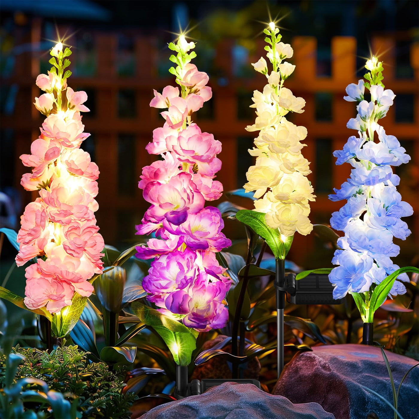 - **Upgraded Solar Flower Lights & 36 Bright LED Beads**: This set includes 4 stunning solar Delphinium flower lights in blue, pink, off-white, and purple, each featuring 9 LED beads for a total of 36 LED beads. These realistic solar flowers are designed with sturdy garden stakes, ensuring they remain upright and resilient against harsh weather.