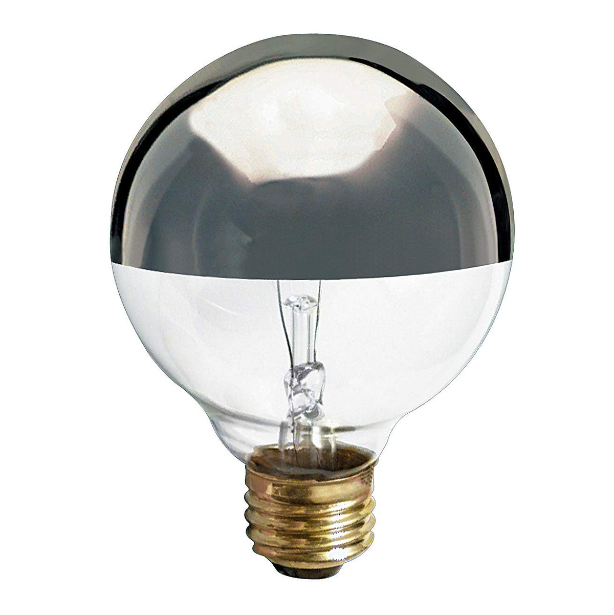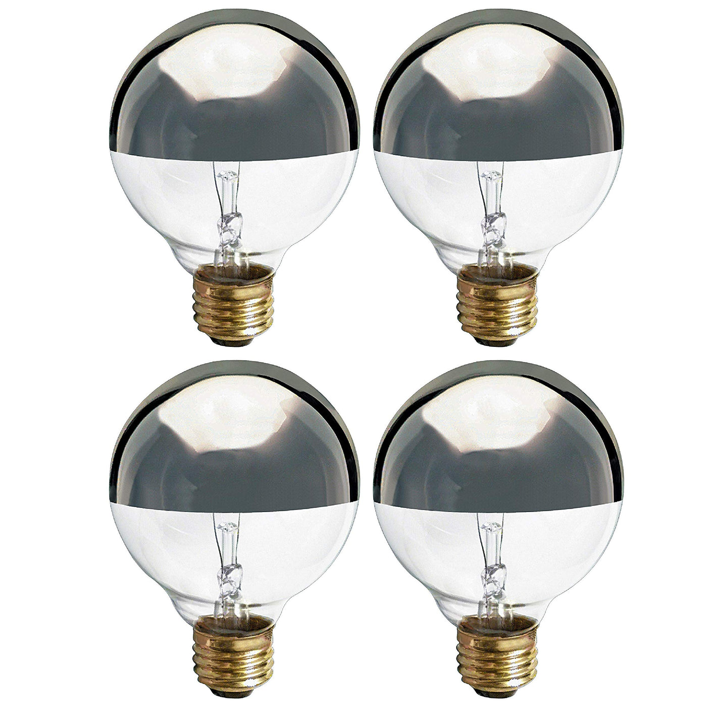 (4 Pack) G25 Incandescent Light Bulb, Silver Half Chrome Crown with Mirror Reflect Glare-Less Finish, Decorative Globe 120 Volts, Lamp Shape, Medium Base, E26 Base, Dimmable. (25 WATT) Add glamour to any d cor with this KOR 25-watt silver-top bulbs. Perfect accent lighting for bathrooms, vanities, chandeliers, and anywhere you want to make a statement. Warm white color light gives out a classic incandescent glow to create a comfortable and relaxing atmosphere. Half chrome light bulbs have a mirrored metallic chrome finish top and reflects the light upward which is a must for pendants hanging over a tabletop or for any base up overhead fixture. The silver bowl light bulb redirects the light into the pedant shade or overhead fixture preventing glare on the tabletop. This type of look is ideal for decorative lighting and is used in chandeliers, outdoor residential lighting, pendant / downlight, as well as portable lamps.