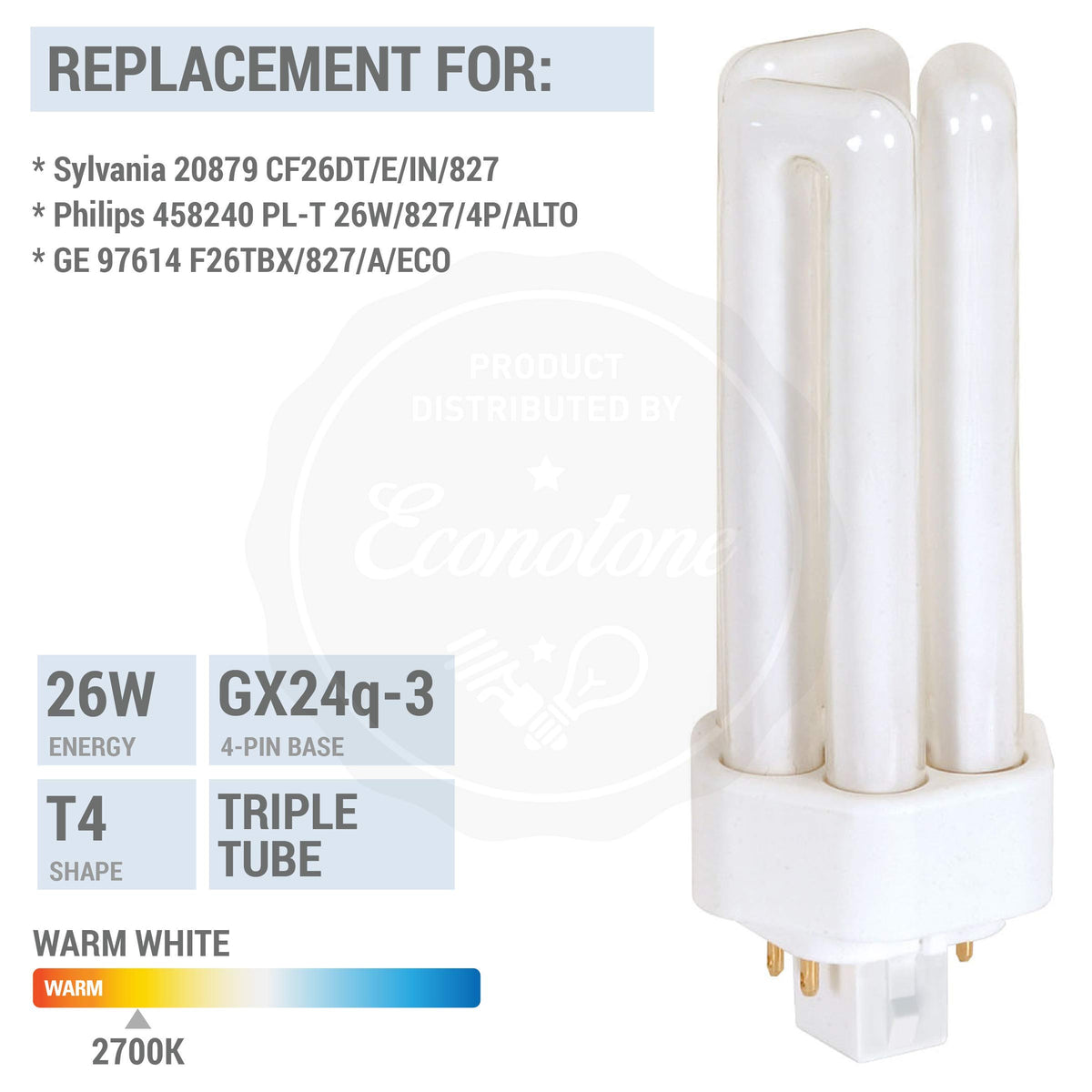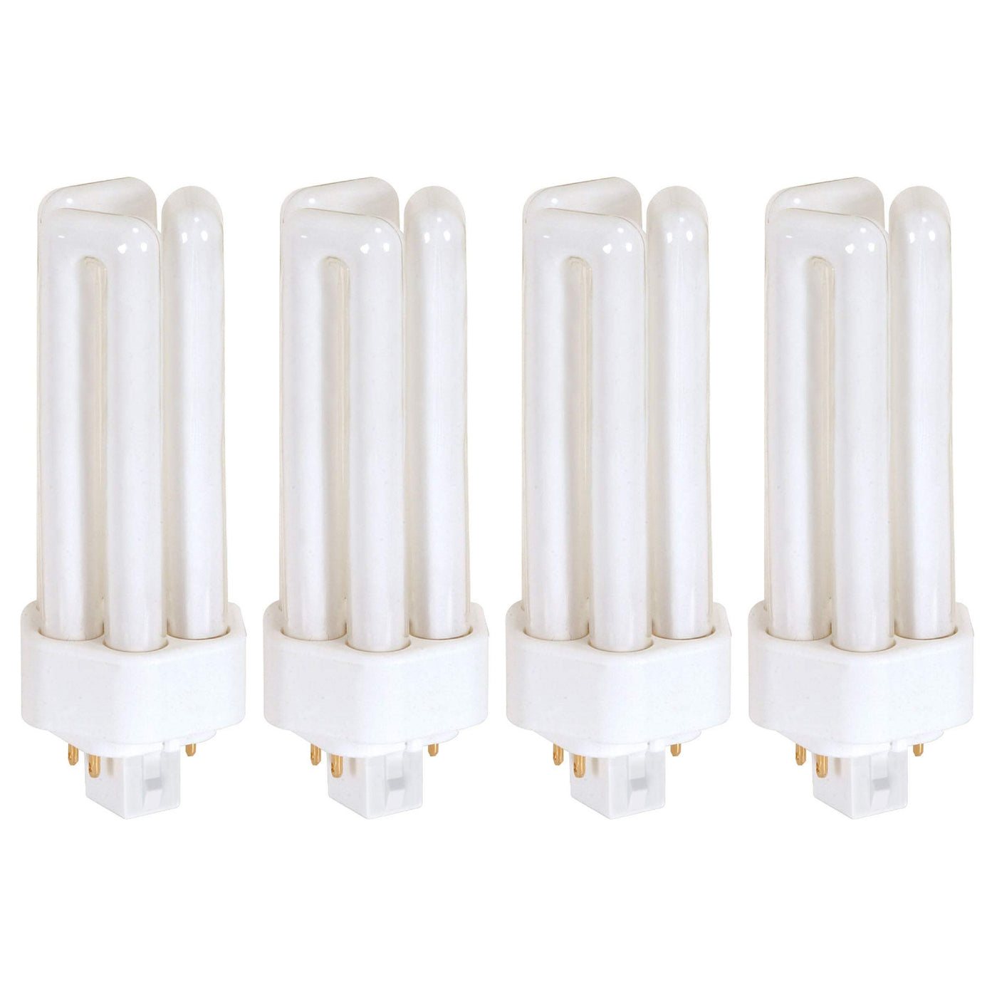 (Pack of 4) 26 Watt Double Tube - GX24Q-3 (4 Pin) Base - 2700K Warm White - CFL Light Bulb. GX23 Base: Plug-in CFL sockets are designed to only work with one style of pin base to ensure the correct light bulb is used to match the ballast in the fixture. So make sure that the base (GX24Q-3) matches exactly to your fixture socket as this will only work with this specific base number and will not interchange with other base/socket numbers. Color Temperature 2700K: This 27K Warm White color temperature is more warm and gives out a warm look and works well for task lighting in kitchens, bathrooms. It is perfect throughout your home and can be used in your desk/table lamps, floor lamps, and open pendant fixtures. Long Life: This 26W compact fluorescent bulb offers a long life compared to a regular 100-Watt incandescent bulb which makes it a maintenance-free option to light your house or any lighting application.
