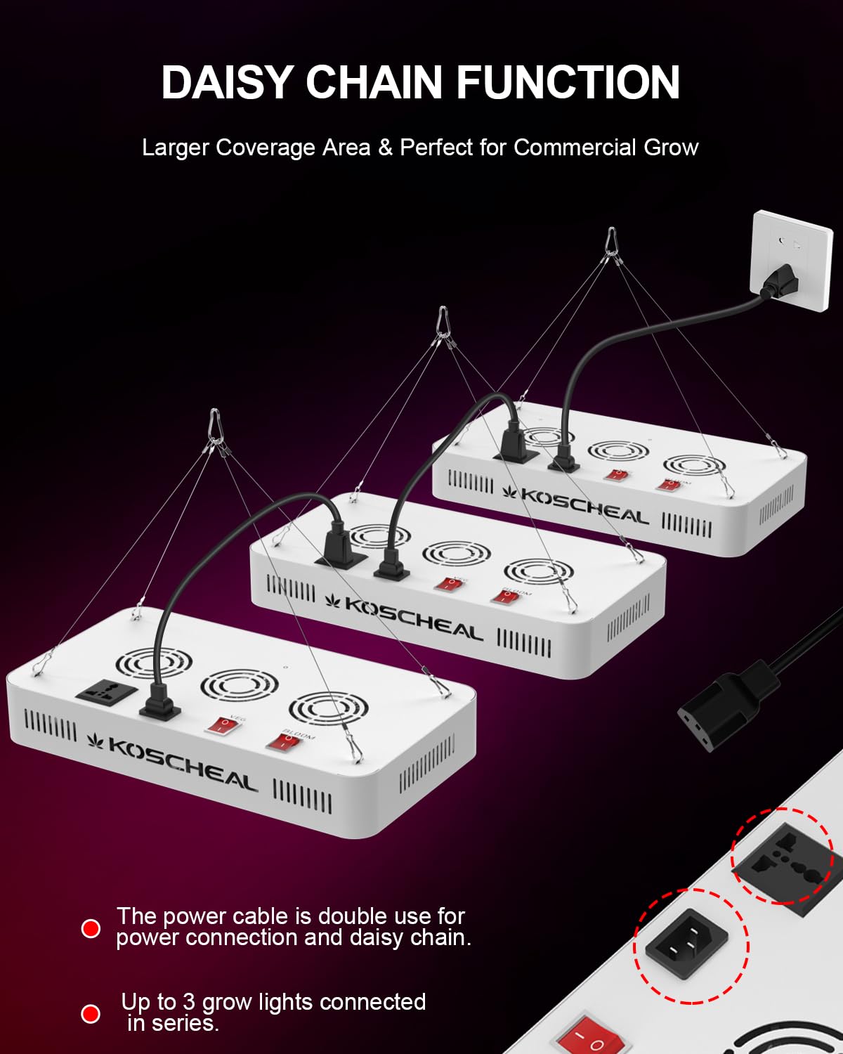 Q: Can multiple KOSCHEAL grow lights be connected together?A: Yes, the KOSCHEAL grow light is daisy chain compatible, allowing you to connect up to three lights together, minimizing cord clutter while extending coverage.