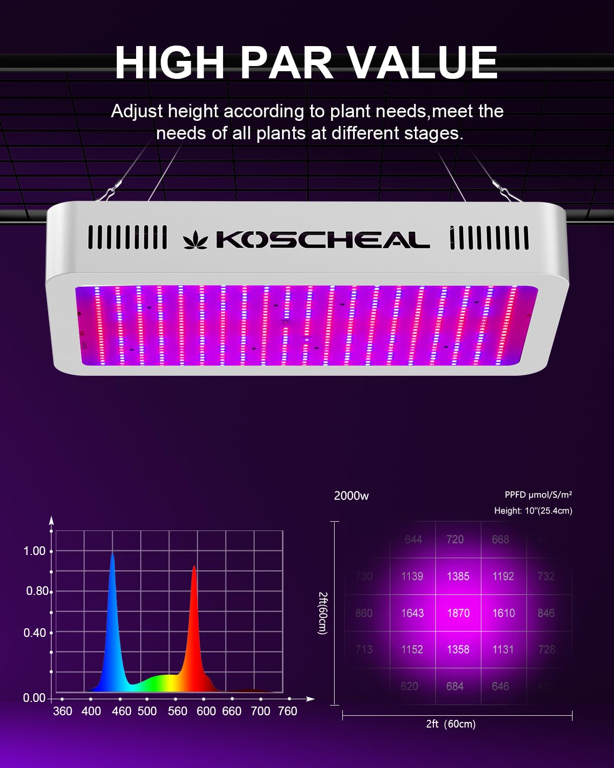 KOSCHEAL 2000W Full Spectrum LED Grow Light with Veg & Bloom Switch, Hydroponic Indoor Plant Lamp, Daisy Chain, 230W Output