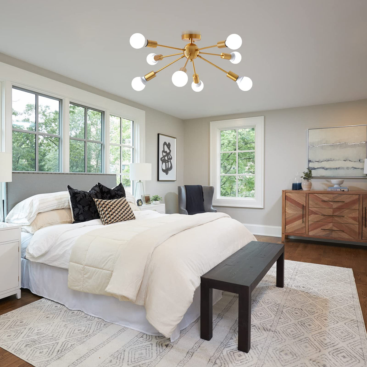 8 lights chandeliers ceiling light fixture with on-trend gold brass finish and design with sputnik satellite shape creates a trendy mid-century modern look and add elegance to space. It's dimmable when used with a compatible dimmer switch and dimmable bulbs to create the perfect atmosphere for any mood you're in. It can decorate contemporary, traditional, rustic, vintage and vanity home decoration. Perfect for bedroom, living room, dining room, kitchen, foyer, bar, coffee shop, restaurant, hallway, rustic, entryway and more.
