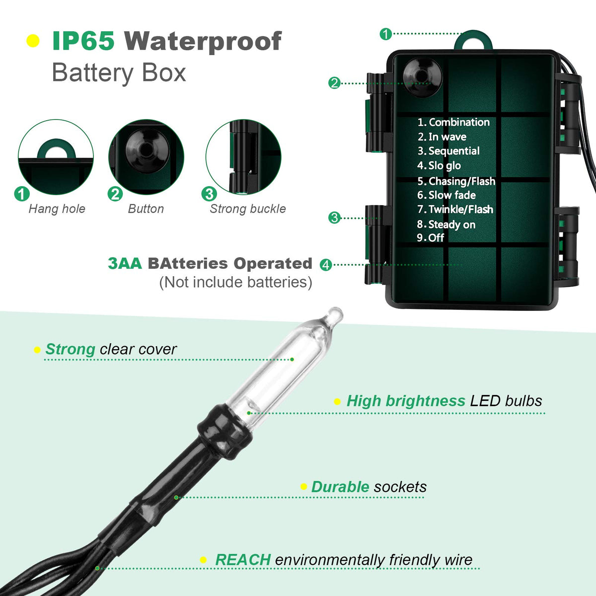 Measuring 18 feet in length with an additional 1.64-foot lead cable, this string of lights features 50 bright LEDs spaced 3.9 inches apart. The lights require 3 AA batteries (not included) for operation, ensuring they can be used anywhere without the need for electrical outlets. With a voltage of 4.5V and a power consumption of 0.3w, these lights are designed to be energy-efficient while providing a delightful illumination.