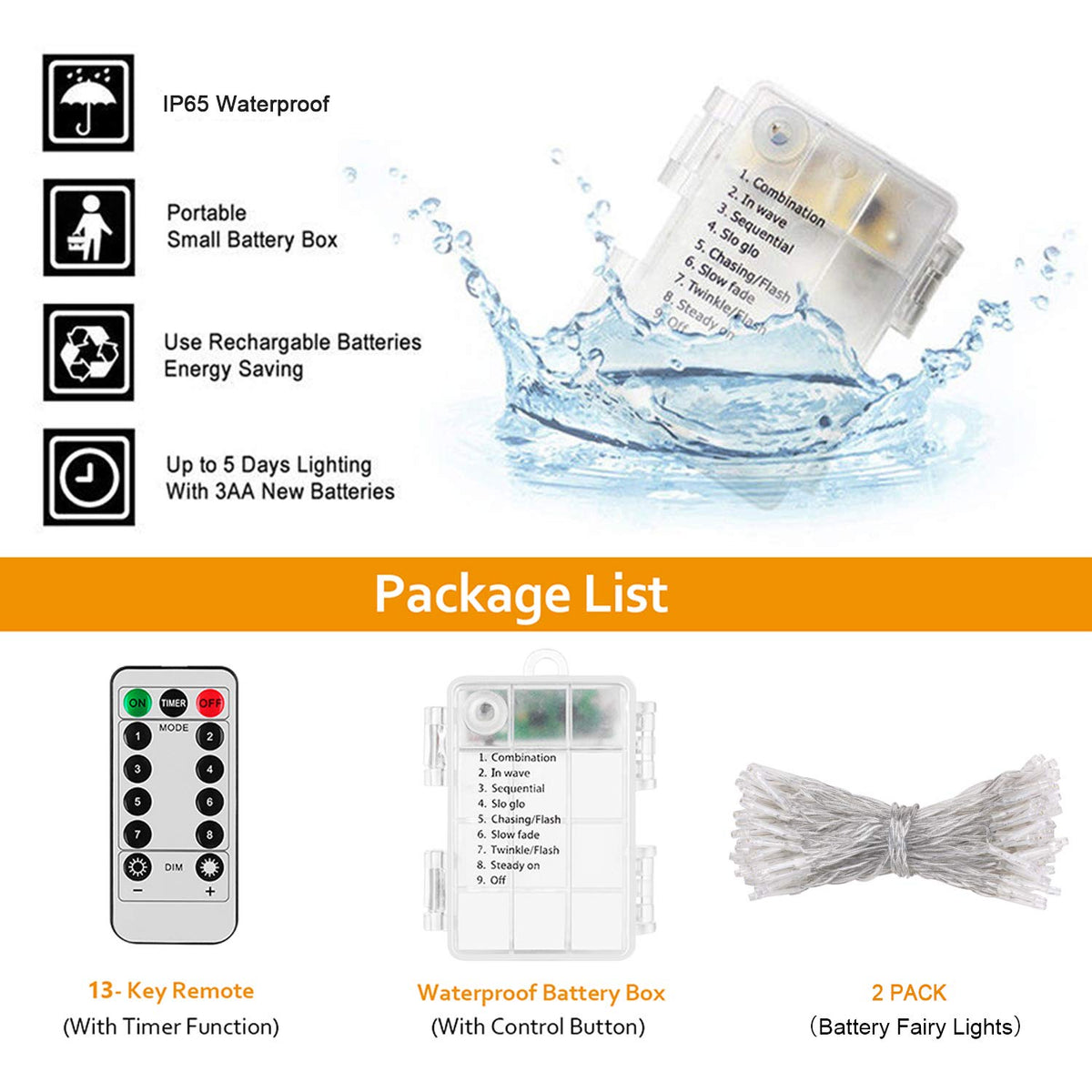 Koxly Outdoor Battery Powered String Lights Give Your Home A Novel Warm Inviting Glow! Koxly Outdoor Battery String Lights Can Be Used Anytime(Such As Christmas, Party, Wedding Garden And Etc.), Indoors And Outdoors.Product Specifications: Lights String: 16.4Ftlead Cable : 1.6Fttotal Length :18Ftled Quantity: 50 Ledsdistance Between 2 Bulbs : 3.9Inbatteries: 3 Aa Batteries Required.Voltage/Capacity: 4.5V(3*Aa)0.3Wpackage Included:? 2 X Outdoor Battery Fairy Lights ? 2 X Remote Control (Cr2025 Battery, Included) 1 X User Manualkoxly Waterproof Battery Fairy Lights - To Brighten Your Home And Life 8 Variable Modes : Combination, In Waves, Sequential, Slo Glo, Chasing/Flash, Slow Fade, Twinkle/Flash And Steady On.Memory Function: Once The Mode Is Selected, The Light Will Work In This Mode Next Time And You Don'T Need To Worry About Re-Set Until Battery Power Is Depleted.Ip65 Waterproof: Koxly String Lights Are Dust And Waterproof With An Ip65 Rating. Great Decor For Indoor & Outdoorbrightness Settings: Press Dim- Or Press Dim+ Of Remote Control To Adjust The Brightness Of The Lights. Warm Tips: 1. Please Purchase Aa Batteries From Reputable Brands And Reliable Retailers.2. The Battery Case Is Ip65 Waterproof, It Doesn'T Mean It Can Be Immersed Into Water For A Long Time, Please Keep The Battery Pack Away From Dampness.3. Please Remove The Battery When You Are Not Using The String Lights.Note Please: 1. By Pressing Off And Then On, The Previous Or Current Mode Will Be Selected.2. How Long The Lights Last Depends On Batteries(3 X Aa Batteries, Not Included). So We Suggest You Select High Quality Batteries. 3. The Timer Function Will Work Only When You Switch To?Imer'.