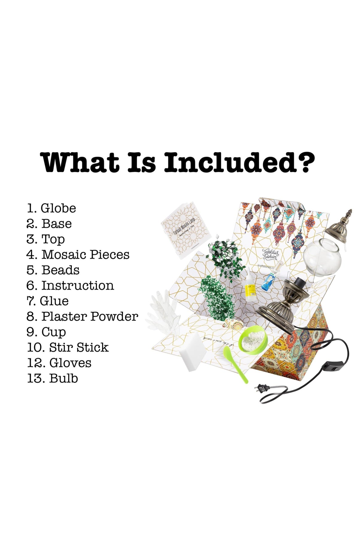 Q: What materials are included in the KRAFTSTORIES Turkish Mosaic Lamp Kit?A: The KRAFTSTORIES Turkish Mosaic Lamp Kit includes an empty glass lamp body, mosaic pieces, glass beads, a lamp lid, glue, plaster powder, disposable gloves, a cup, a stir stick, instructions, a US-based plug, and an LED bulb.