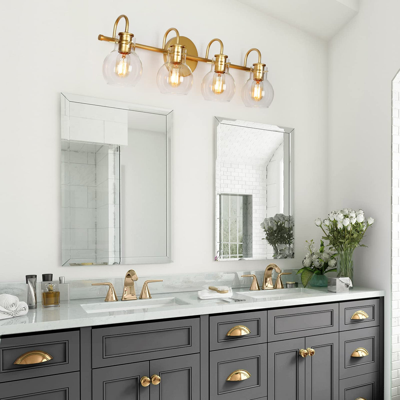 ?Timeless and Classic Design?- This vanity light adds an extremely modern ambience, luxurious soft gold finish fittings with 4 classic globe clear glass shades, that is ideal for a variety of decor styles. The curved socket becomes the finishing touch to this gold vanity light, which is rounds out the design with a farmhouse and vintage vibe. | ?Durable Material & Excellent Quality?- This gold bathroom light will be a great choice to update your bathroom with its excellent quality! Made of high quality metal material, the gold bathroom vanity light is not easy to lose paint and bend, and its surface is waterproof, making it rust-proof. Transparent glass shade is thicker than the normal glass shade, which is not easy to break up. Open bottom design can effectively improve heat dissipation, easy to clean and install bulbs. | ?28.5'' Large Size?- Bathroom light fixtures size: 28.3''L x 6.5''W x 8.5''H. Globe glass shade size: 5 inch in diameter. Back plate size: 6'' W x 1''H. The classic design and large size made the brushed gold vanity light is ideal for master bath or double-sink vanity. This bathroom lighting is perfect for placement in dressing room, mirror cabinet, hallway, bedroom, kitchen, living room and other interior places. | ?E26 Bulb & Dimmable?- The vanity lighting fixture is compatible with all E26 bulbs (Max 60W, Type A, Not Included) such as LED, CFL and Halogen bulbs etc. The brass vanity light is dimmable when you use dimmable bulb and dimmer switch (not included), you can adjust the brightness according to your lighting needs. | ?Easy to Install?- Installation can be completed in 10 minutes. The brass bathroom light fixtures have pre-assembled and come with necessary installation parts. All you need to do is screwing in the bulbs and glass shade, then mounting up and wiring up. The gold bathroom vanity light can be mounted upwards or downwards according to your preference.