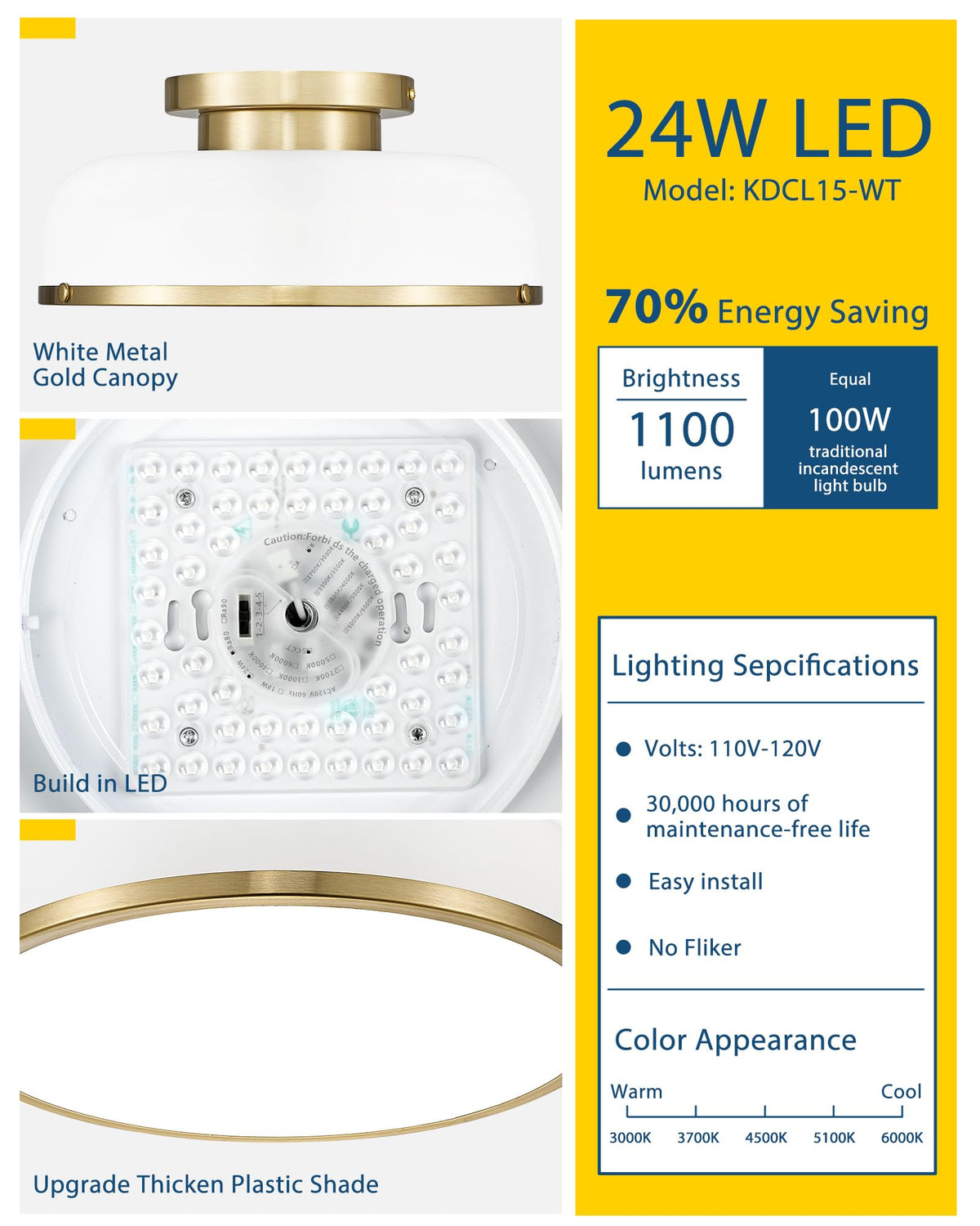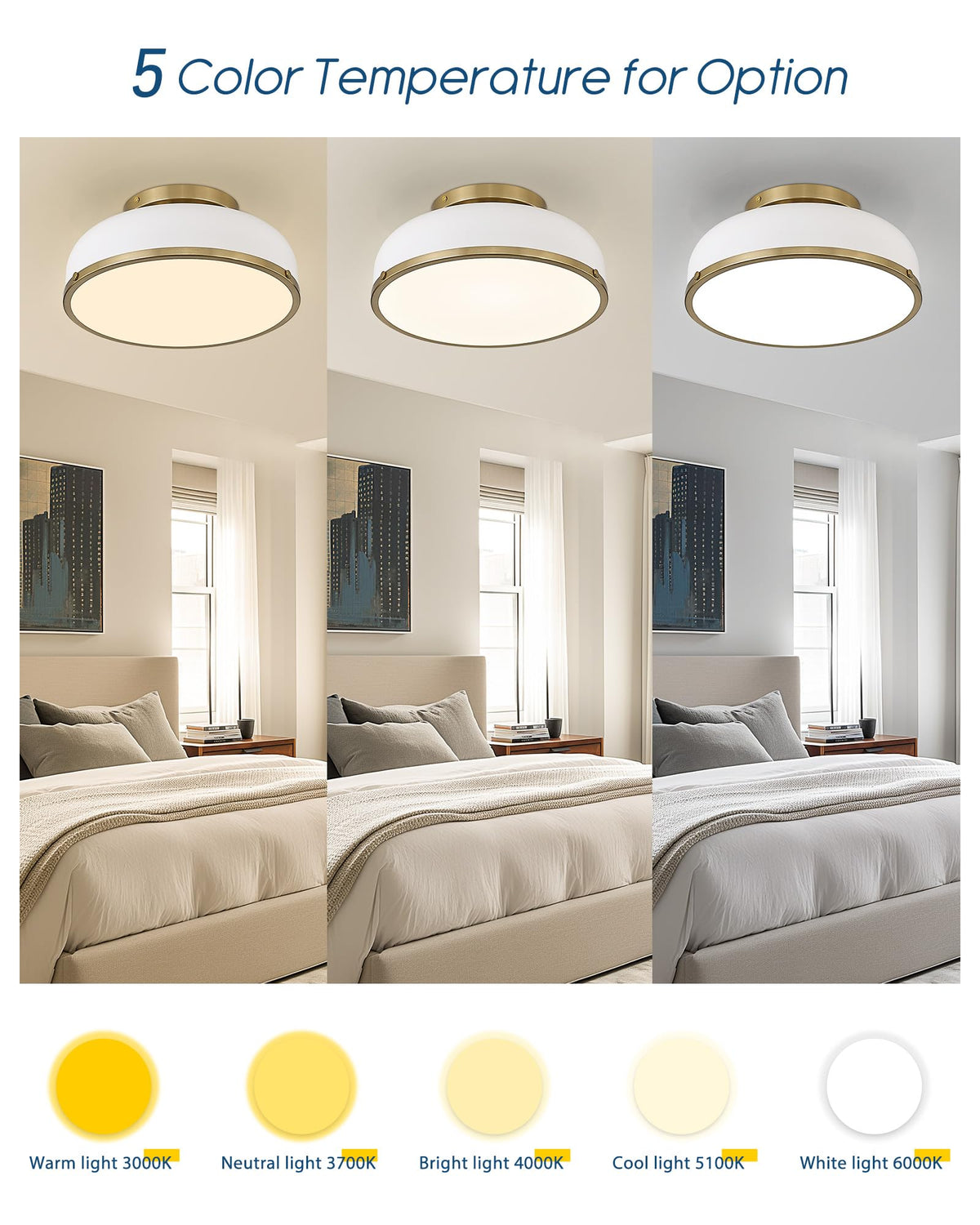 Q: What are the different color temperature options for the Kudos Ceiling Light?A: The Kudos Ceiling Light offers five adjustable color temperature options: 3000K (warm light), 3700K (neutral light), 4500K (cool light), 5100K, and 6000K. You can easily change the color temperature by sliding the button on the product.