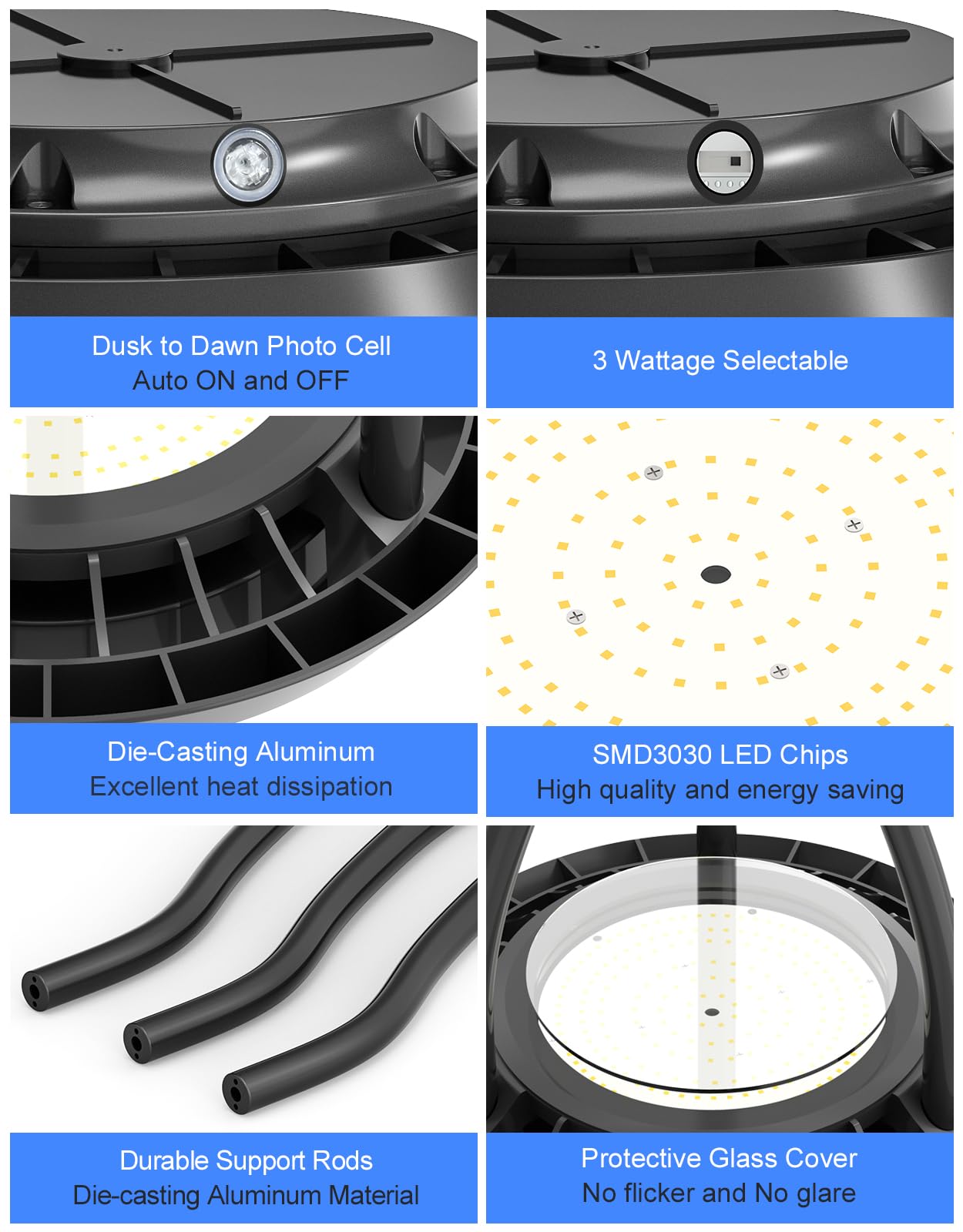 Q: How does the Dusk to Dawn feature work?A: The built-in Dusk to Dawn photocell automatically turns the light on at night and off during the day, ensuring that your outdoor spaces are well-lit without the need for manual operation.