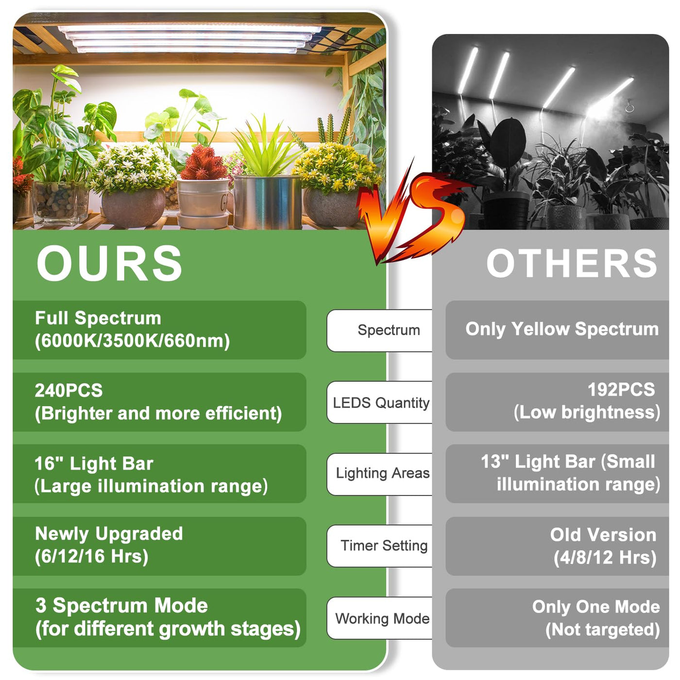 Kullsinss Grow Lights For Indoor Plants, 16" Full Spectrum Plant Grow Light Strip With Upgrade Timer 6/12/16 Hrs, 3 Spectrum Modes, 240 Leds Sunlike Growing Lamp For Seedlings Hydroponics Succulent