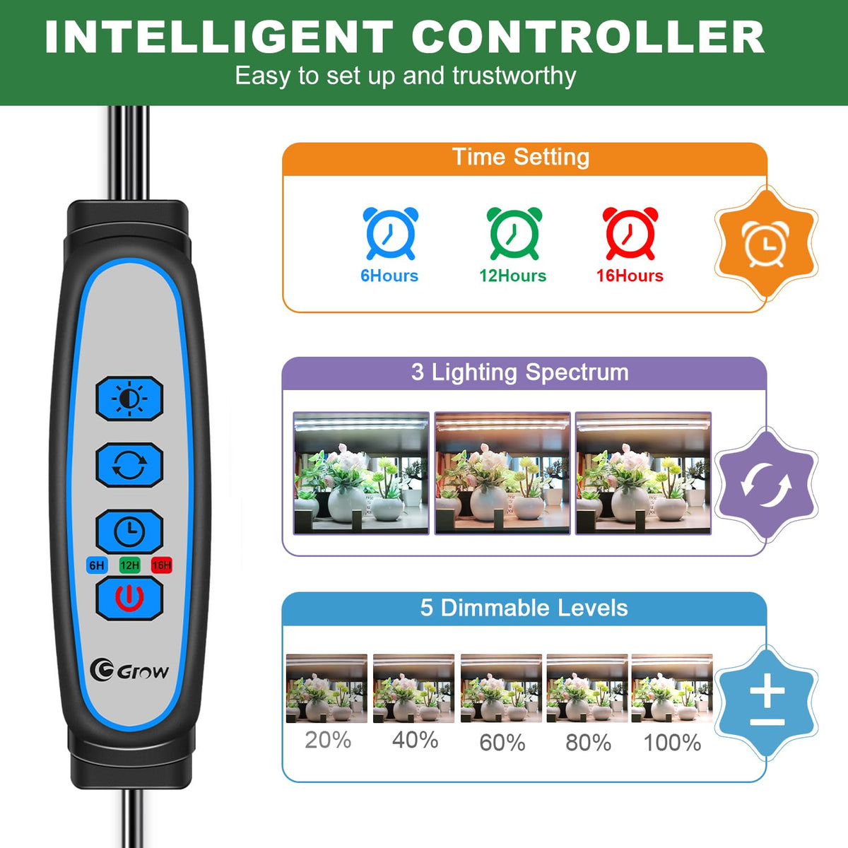 Q: How do I set the timer for the grow light?A: The grow light comes with an auto turn on/off timer with three settings: 3, 9, or 12 hours. Simply select your desired timer setting, and the grow light will automatically turn on and off at the same time each day.