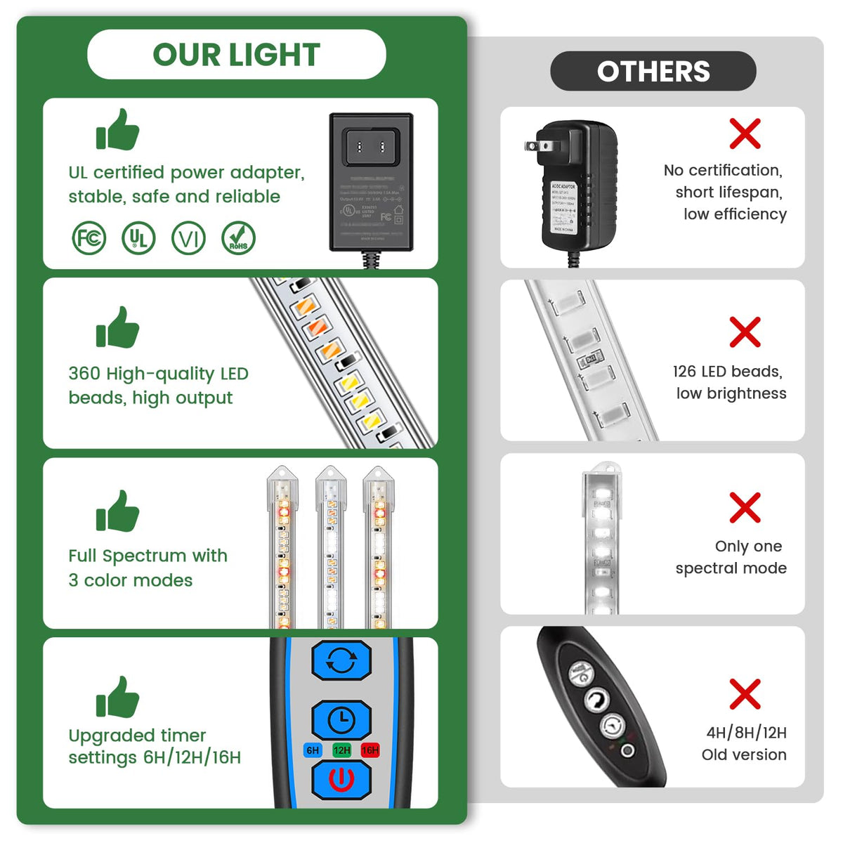 Q: Can I set a timer for the grow light, and what are the options?A: Yes, the Kullsinss LED Plant Grow Light Strip features a built-in timer with three options: 6 hours, 12 hours, and 16 hours. This allows you to provide your plants with the optimal amount of light for photosynthesis based on their specific needs.