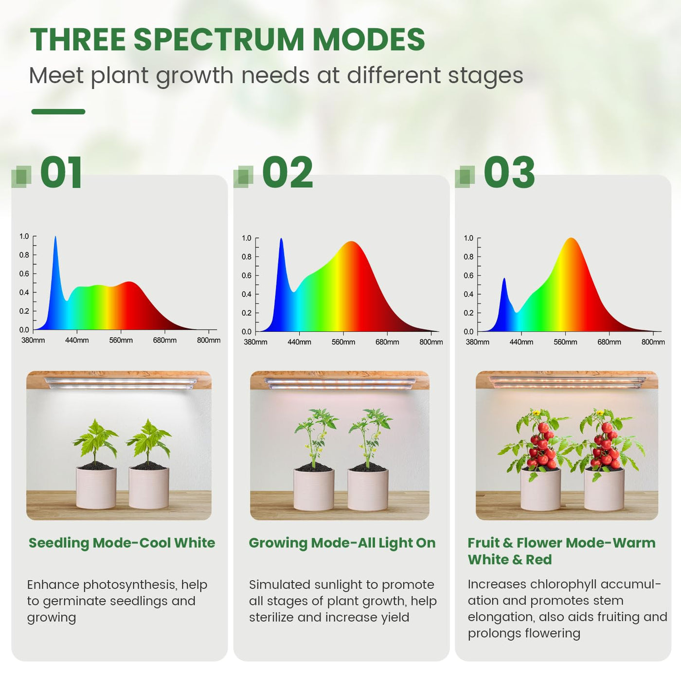Q: What spectrum modes does the Kullsinss Under Cabinet Grow Light Strip offer?A: The Kullsinss Under Cabinet Grow Light Strip features three spectrum modes: 3000K warm light, 6000K white light, and 660nm red light. This combination provides an ideal full spectrum for all growth stages of indoor plants.