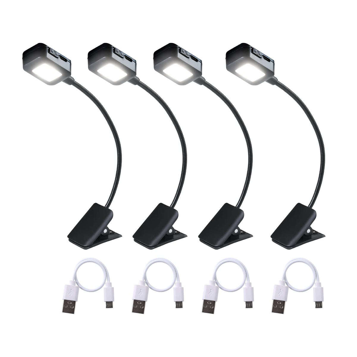 Q: What is included in the KunHe Rechargeable Book Lights package?A: The KunHe Rechargeable Book Lights package includes four small rechargeable clip-on book lights, each with its own charging cable for convenience.