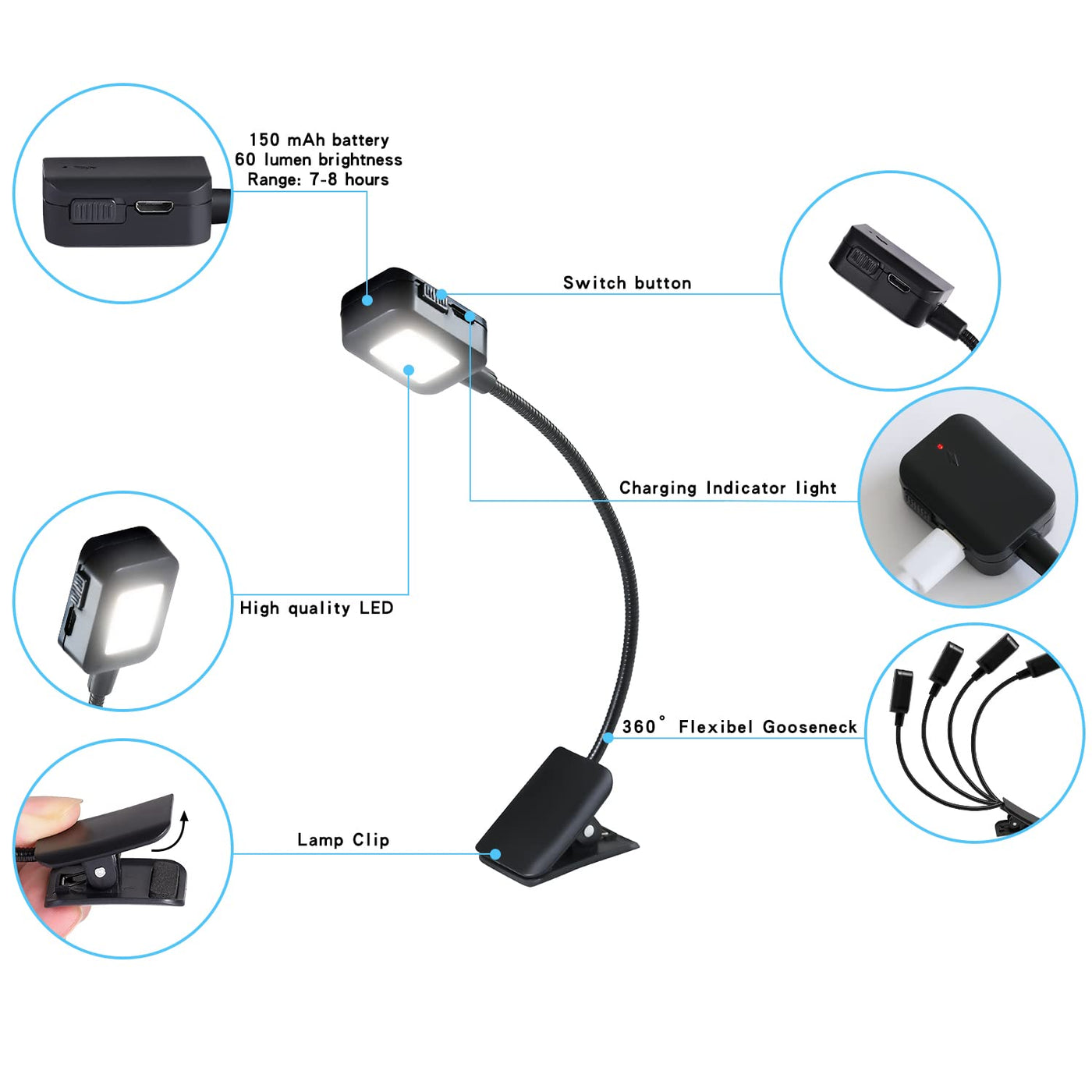 Constructed from durable Acrylonitrile Butadiene Styrene (ABS), these lights are both lightweight and sturdy. Their compact design allows for easy transport, making them ideal for readers on the go. The flexible 360-degree adjustable gooseneck enables users to direct light exactly where it is needed, whether you are reading in bed, studying late at night, or enjoying some outdoor reading during camping trips. The built-in rechargeable battery, with a capacity of 300mAh, supports up to 8 hours of continuous use on a single charge, which takes just 1.5 hours to fully recharge. This eco-friendly design reduces battery waste, making it a sustainable choice for conscientious consumers.
