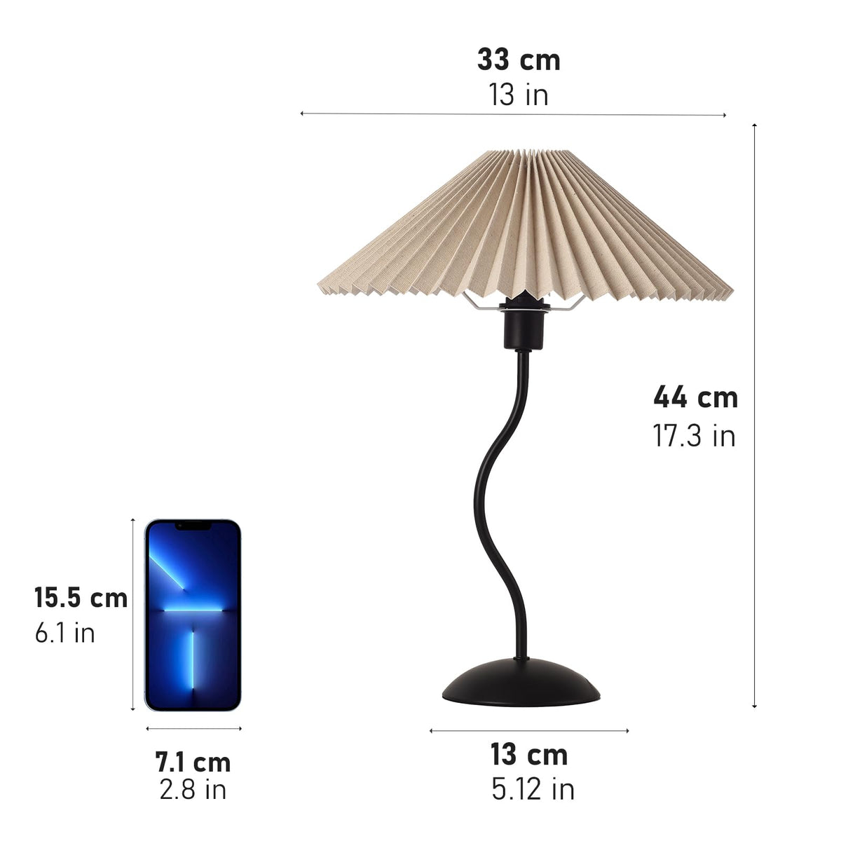 Q: What are the dimensions of the KUNJOULAM Table Lamp?A: The KUNJOULAM Small Pleated Table Lamp has a height of 44 cm (17.3 inches), a lampshade height of 13.5 cm (5.31 inches), and a base diameter of 13 cm (5.11 inches). Its compact size makes it suitable for various indoor settings.