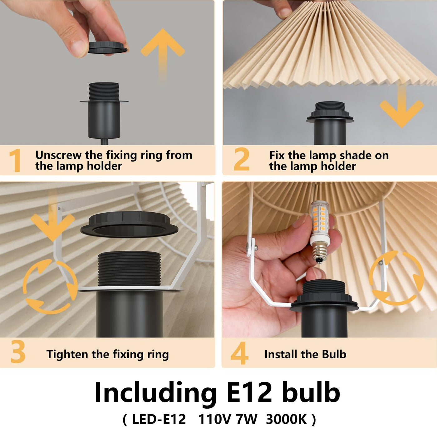 Q: What type of bulb does the KUNJOULAM Small Pleated Table Lamp use?A: The KUNJOULAM Small Pleated Table Lamp uses an E12 base bulb, and it includes a 5W 3000K LED bulb in the package. You can also use other compatible bulb types such as LED, CFL, halogen, or incandescent, with a maximum wattage of 40W.